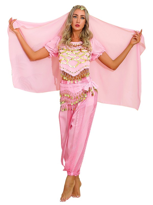 Set Include: 1x Top, 1x Harem Pants, 1x Hip Scarf, 1x Head Scarf