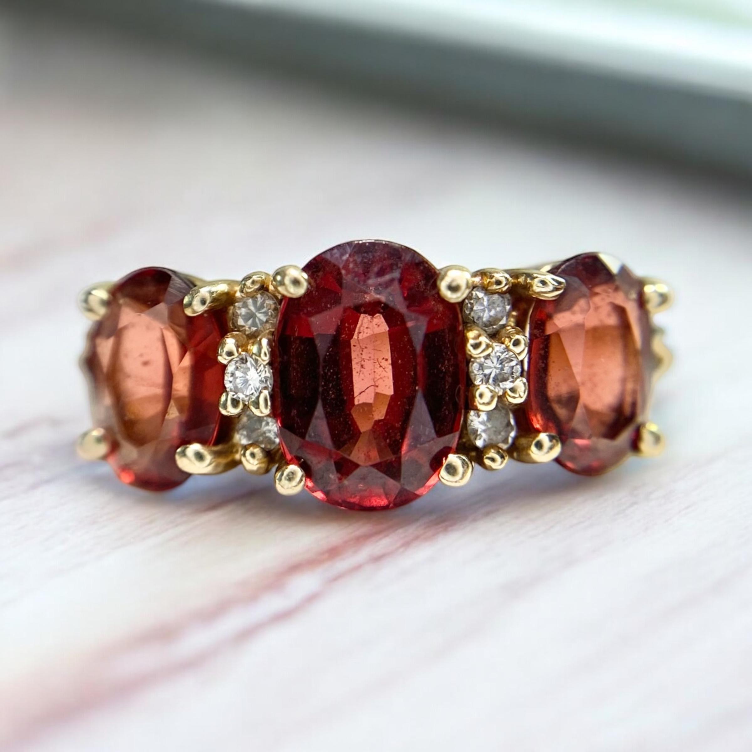 Here is a striking 10k Yellow Gold ring featuring a captivating arrangement of oval-cut garnets. The deep red stones are elegantly complemented by round-cut white diamonds, adding a touch of brilliance. Crafted in 10k yellow gold, the design is both luxurious and refined. The ring is a size 9.75 and weighs 2.9 grams. This exquisite piece would make a perfect gift or a standout addition to any collection. CHECK ITEM SPECIFICS FOR DETAILS. STOCK DNRARI