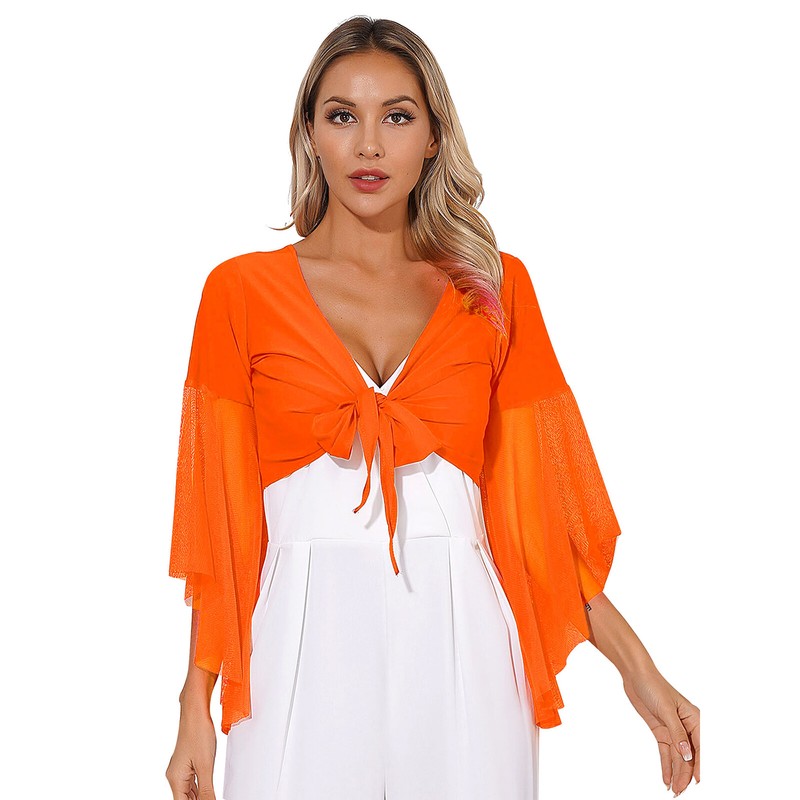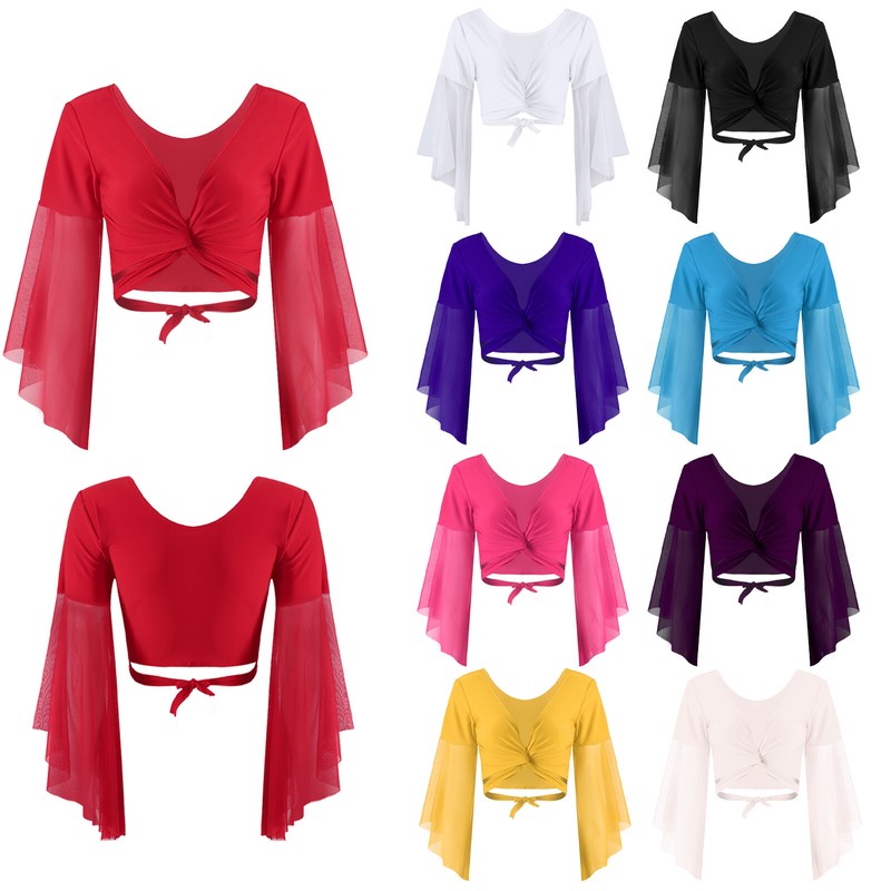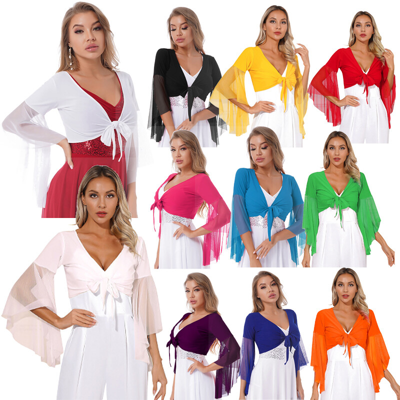 Womens V Neck Lace-up Belly Dance Tops 3/4 Tulle Flared Sleeve Crop Top.