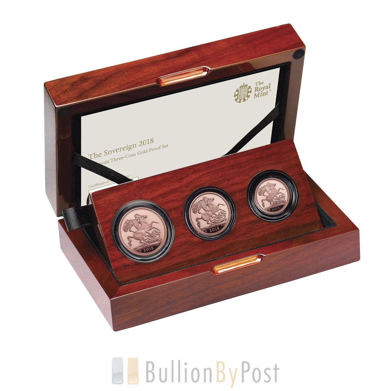The 2018 gold Proof Sovereign 3-coin set from The Royal Mint. This set includes the Double Sovereign, the Sovereign, and the Half Sovereign coins.