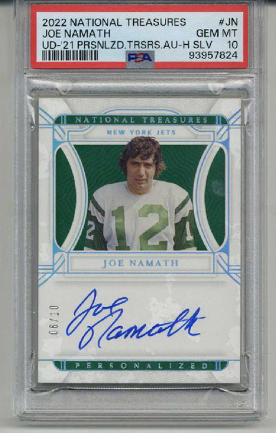 The item you are buying is a PSA GRADED and ENCAPSULATED 2022 Panini National Treasures Update '21 Personalized Treasures Autographed Holo Silver LE 06/10 #JN card of Joe Namath. The card was graded a 10 by PSA. This card comes from my personal collection. The plastic of the encapsulation has no cracks and is scratch free.