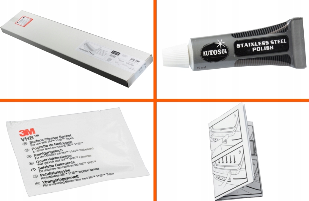 Sie erhalten das Overlay in einer robusten Verpackung mit einer Schritt-für-Schritt-Montageanleitung und einem 3M-Entfettungstuch. Ihrer Bestellung liegt außerdem eine Tube Autosol (5 ml) zum Polieren und Renovieren von Edelstahl bei. Die hervorragende Formulierung des Produkts verleiht der Stahloberfläche einen dauerhaften kratzfreien Glanz und eine solide Schutzschicht.