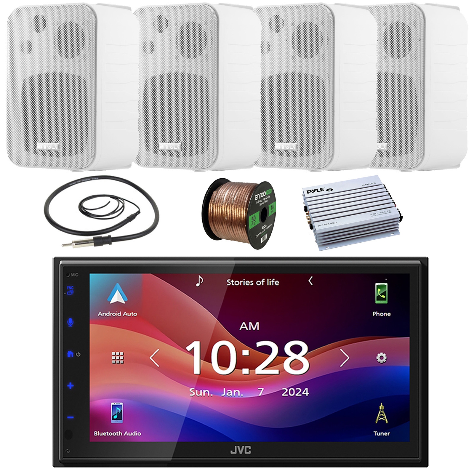 • PACKAGE BUNDLE INCLUDES: JVC KW-M695BW 6.8" WSVGA LCD Display Single-DIN Bluetooth USB/MP3 Digital Media Shallow Chassis Multimedia SiriusXM Ready Receiver, 4x Enrock Audio EKMR408W 4" 30 Watts Max Power 3-Way In Door/Out Door White Box-Speakers, Pyle PLMRA400 Marine 4 Channel 400 Watt Amplifier, 22" Radio Antenna, 50 Feet 16 Gauge Speaker Wire