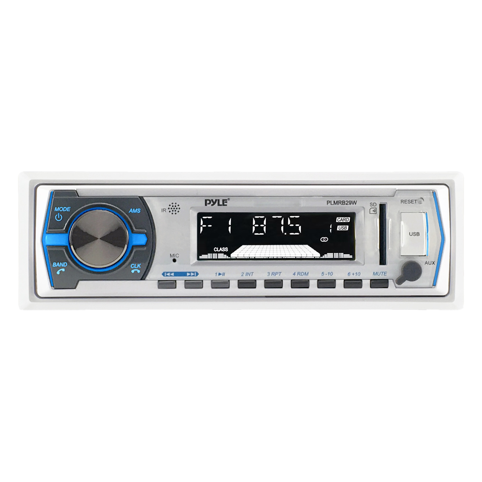 Pyle PLMRB29W Single DIN Bluetooth Marine MP3 In-Dash Stereo Receiver w/ Remote Control (White) Sound Around - PLMRB29W The Pyle PLMRB29W Stereo Headunit System features versatile media playback capability. Built-in Bluetooth allows for wireless music streaming and the built-in microphone gives you hands-free calling ability. Conveniently answer or reject incoming calls safely so you can focus on navigation. The single DIN universal standard comes loaded with features like AM/FM radio with 30 station memory, USB flash drive reader, SD memory card reader and Aux (3.5mm) input connector jack. You'll have the ability to connect and stream audio from all of your favorite devices (like smartphones, tablets, MP3 players, etc.)