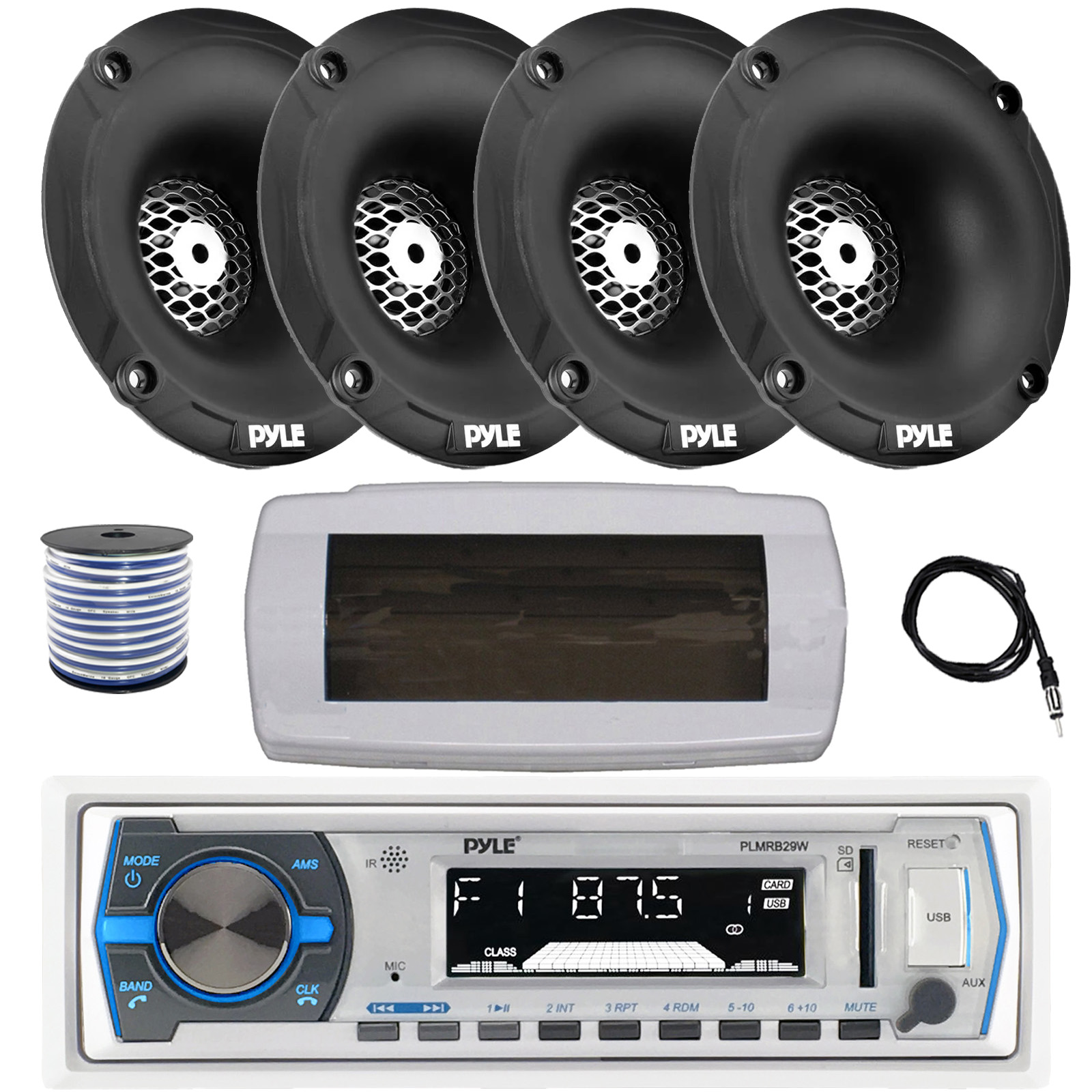 Pyle PLMRB29W Single DIN Bluetooth Marine MP3 AM/FM Stereo Receiver with White Cover, 22" Radio Antenna, Wire, 4x 1" 120 Watt Max Waterproof Audio Tweeters w/Crossover Network (Black)