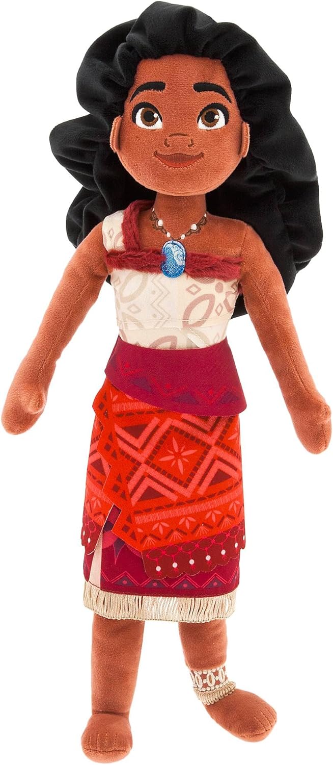 Our adventurous Polynesian explorer Moana shows her softer side with this soft toy doll. Dressed in a traditional tapa print outfit with furry and fringe trims - plus glitter Heart of Te Fiti pendant - she's ready to set sail into your heart.