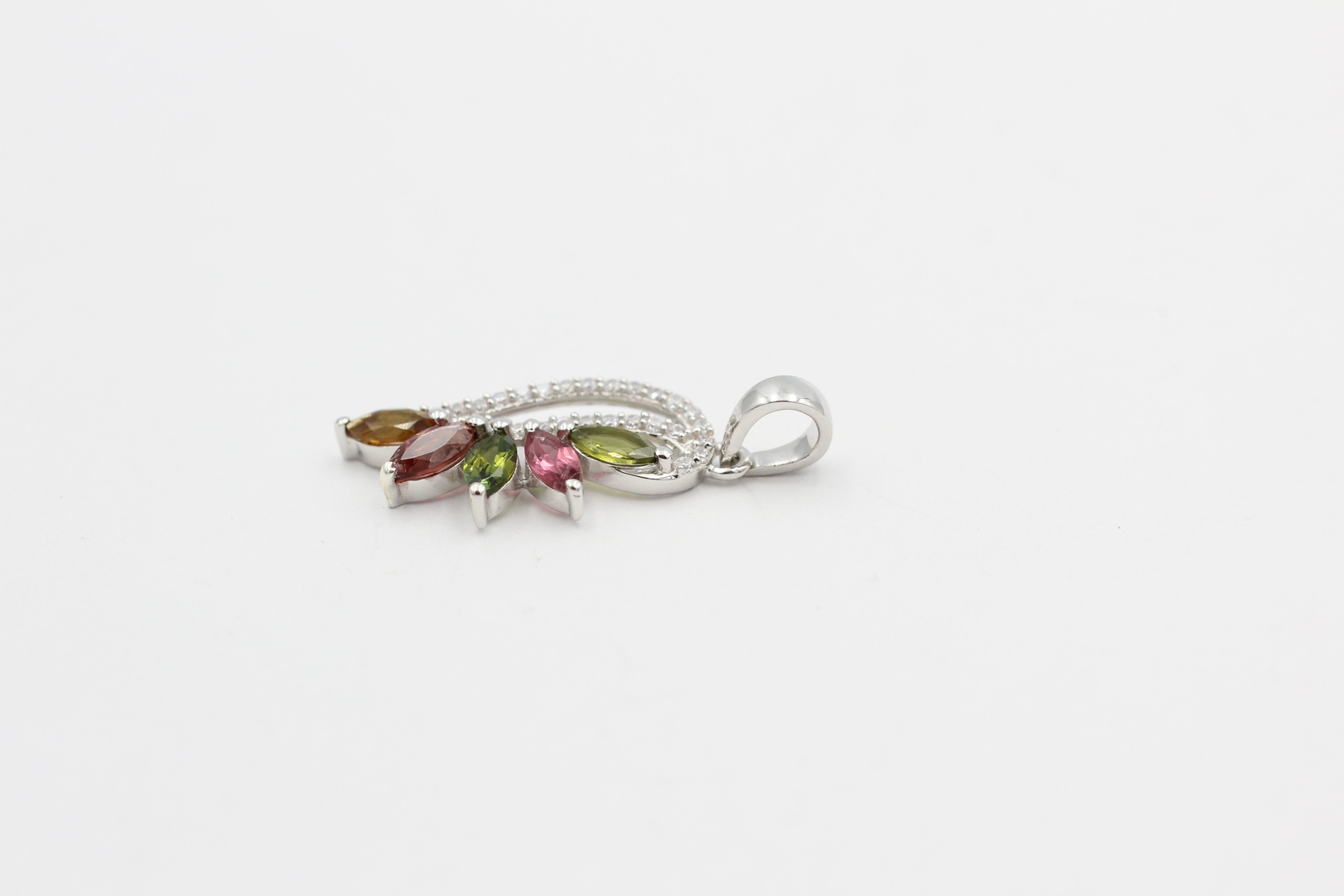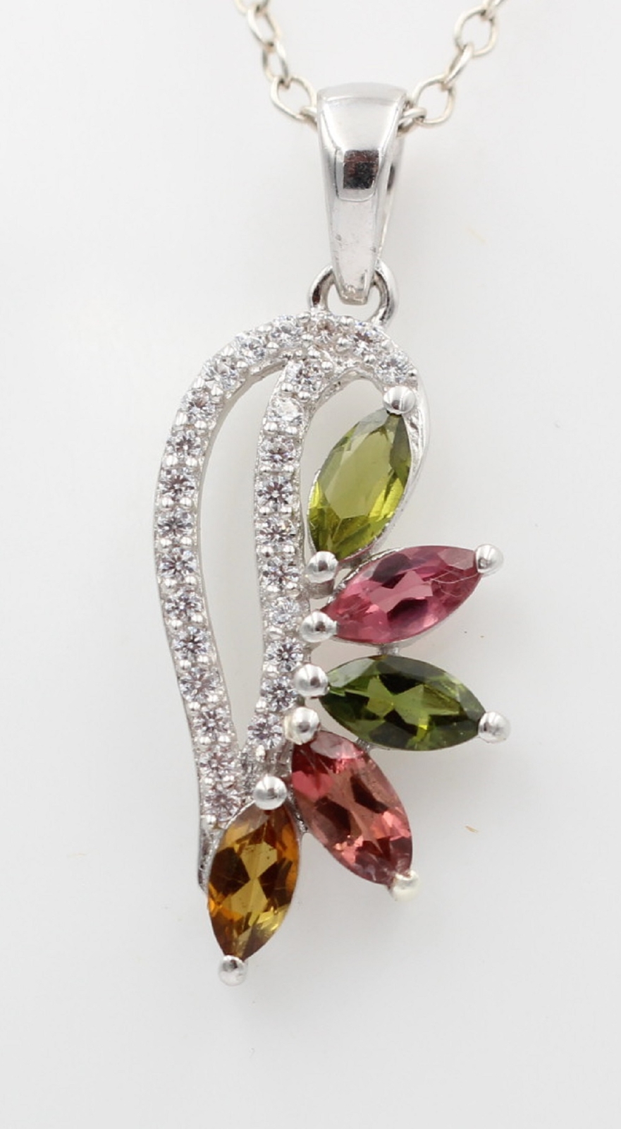 » Produktbeschreibung 1,26 Carat Turmalin Anhänger dieser wunderschöne Anhänger wurde aus hochwertigem 925 Sterling Silber gefertigt. Der Anhänger hat eine Größe von ca 3,59 x 1,162 cm. Mit Öse ist der Anhänger a 3,9 cm lang mit einem Gewicht von ca 2,13 gr. Der Anhänger hat ein wundervolles Design. Das Highlight sind die 5 verschieden farbenen Turmaline. Damit der Schmuck noch richtig zur Geltung kommt sind noch 27 kleine Zirkonias kunstvoll eingefasst. Die Edelsteine sind von Hand facetiert und kunstvoll eingesetzt. Ein wirklich schöner Schmuc Art: Anhänger Material: 925 Sterling Silber Länge: ca 3,9 cm Gewicht: ca 2,13 gr Edelstein: 5 x Turmalin, grün pink orangebraun 6x 3 mm Schliff: Navette Marquise Akzentsteine: 27 x Zirkonia 1,2 mm Schliff: Rund