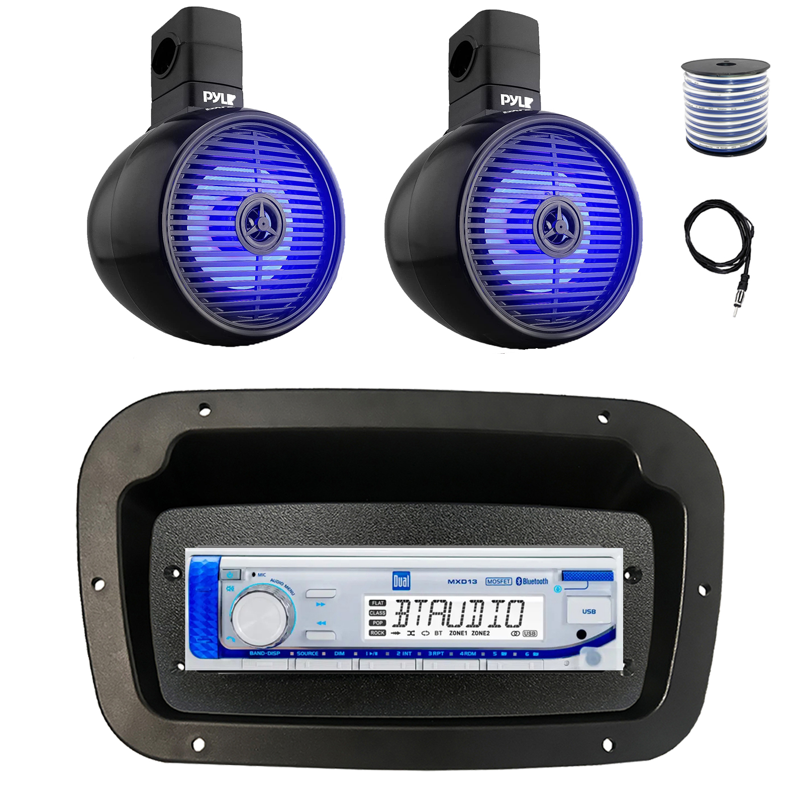 • PACKAGE BUNDLE INCLUDES: Dual MXD13 Single DIN Bluetooth Marine MP3 AM/FM Stereo Receiver, Spa bezel, Adapter Plate, Radio Antenna, Wire, 2x 8" 300W Max 2-Way Full Range Wakeboard Built-in-LED Single Audio Speakers (Black)