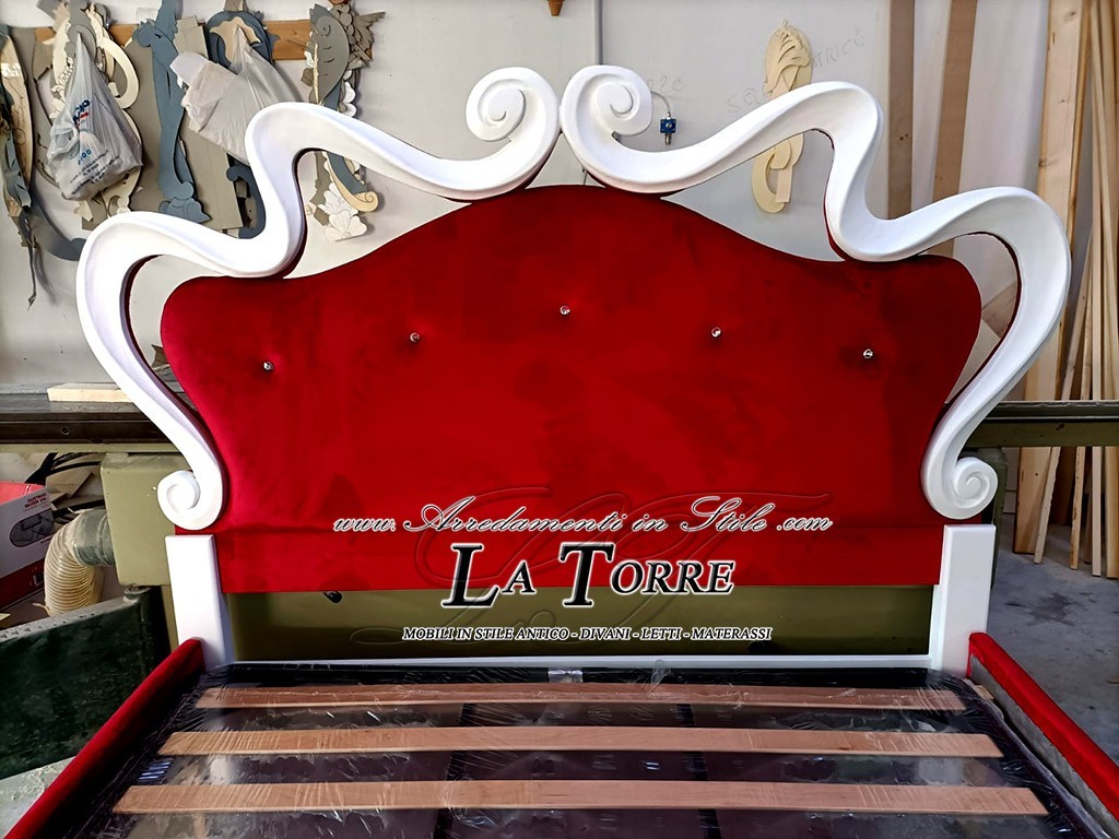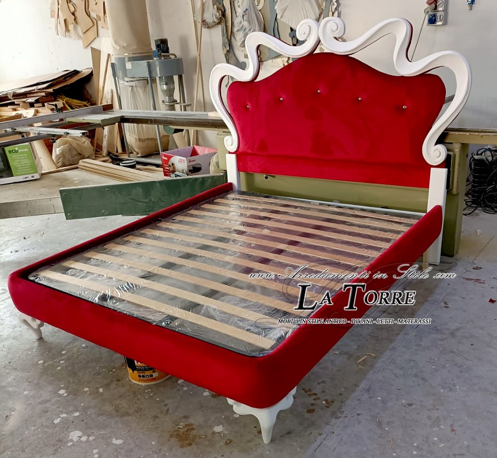 Letto una piazza e mezza contenitore Barocco velluto o ecopelle rosso struttura bianca Mary, caratterizzato da una testiera sontuosa e imponente, rivestita in un ricco velluto rosso intenso, trapuntato con bottoni per un effetto capitonné che aggiunge profondità e raffinatezza. La testiera è delineata da una cornice sinuosa e voluttuosa, rifinita in una tonalità in laccatura bianca che crea un contrasto audace e affascinante con il rosso scarlatto. Anche la pediera e i bordi laterali del giroletto sono rivestiti nello stesso prezioso velluto rosso, conferendo continuità e un senso di opulenza all'intera struttura. I piedini curvi, anch'essi rifiniti nella stessa tonalità chiara della cornice, riprendono le forme sinuose tipiche del Barocco, aggiungendo un tocco di leggerezza e grazia a un mobile altrimenti imponente.