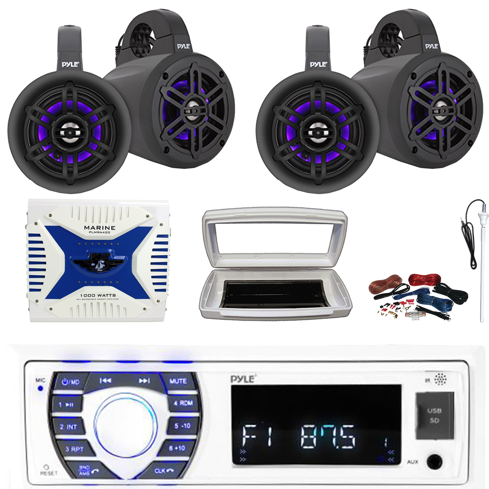 • PACKAGE BUNDLE INCLUDES: Pyle PLRMR23BTW Single-DIN Bluetooth Marine USB/AUX MP3/SD AM/FM Radio Stereo Receiver W/White Marine Stereo Splash Cover, 4x Pyle PLMRLEWB47BB 4" 300 Watt Max Power Waterproof Marine Wakeboard LED Tower Black Speakers, PLMRA420 Pyle 4 Channel 1000 Watt Waterproof Marine Bridgeable Mosfet White Amplifier W/8-Gauge Amplifier Wiring Installation Kit, Flexible Long Range Radio Antenna