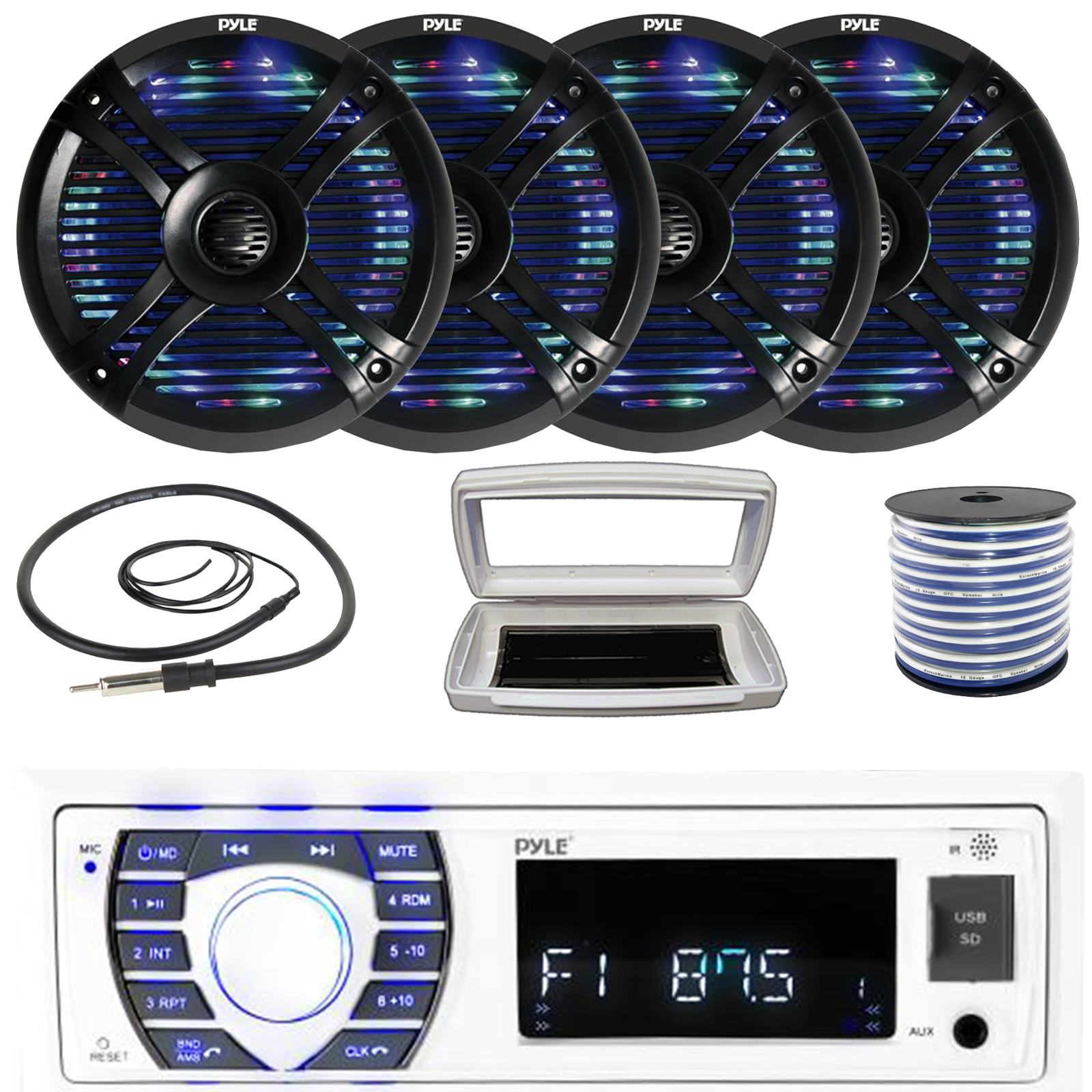 PACKAGE BUNDLE INCLUDES: Pyle PLRMR23BTW Single-DIN Bluetooth Marine USB/AUX MP3/SD AM/FM Radio Stereo Receiver W/White Marine Stereo Splash Cover, 4x Pyle PLMRX68LEB 6.5" 250W Max Power Waterproof Boat Dual Multi Color LED Black Speakers, 50 Feet 18 Gauge Speaker Wire, 22" Radio Antenna
