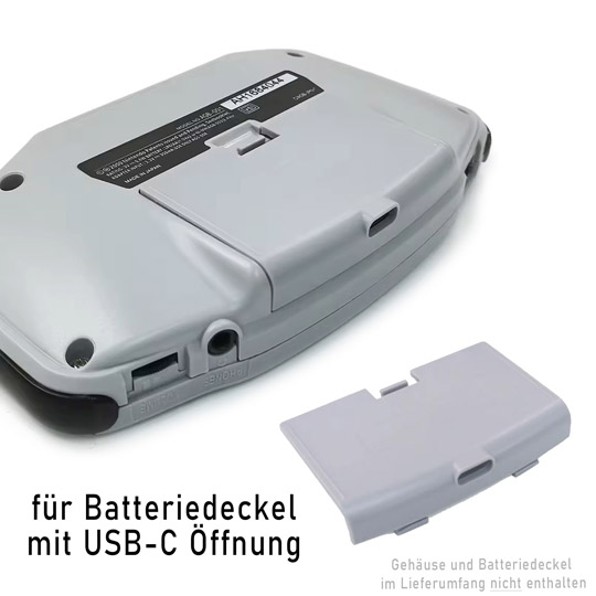 jedem Handelsüblichen USB Netzteil erfolgen. Der USB-C Zugang befindet sich auf der Unterseite des GBAs im Batteriedeckel. Ein Batteriedeckel ist bei der Lieferung nicht enthalten, aber er wird bei dem gesondert bei uns erhältlichen GBA Gehäuse von HISPEEDIDO dabei sein.
