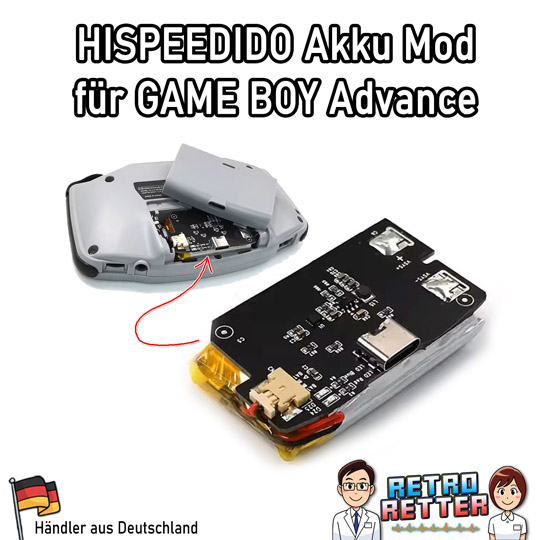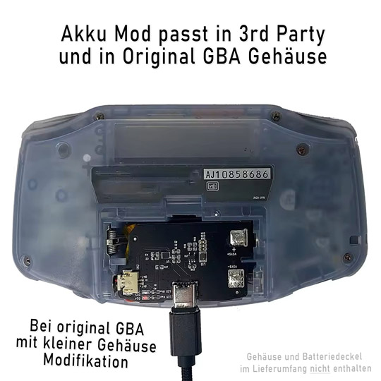 GAME BOY Advance. Spiele mit einer Ladung des 1800 mAh Akkus deutlich länger als mit den zwei AA Batterien eines GBA. Du kannst das original GBA Gehäuse für den Mod zuschneiden oder du kaufst ein extra Gehäuse, welches für den Mod bereits vorkonfiguriert ist. Beides ist möglich. Das Laden erfolgt mittels eines USB-C Anschlusses und kann an