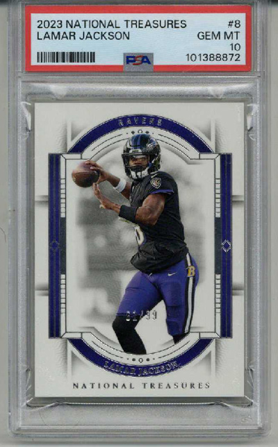 The item you are buying is a PSA GRADED and ENCAPSULATED 2023 Panini National Treasures LE 61/99 #8 card of Lamar Jackson. The card was graded a 10 by PSA. This card comes from my personal collection. The plastic of the encapsulation has no cracks and is scratch free.