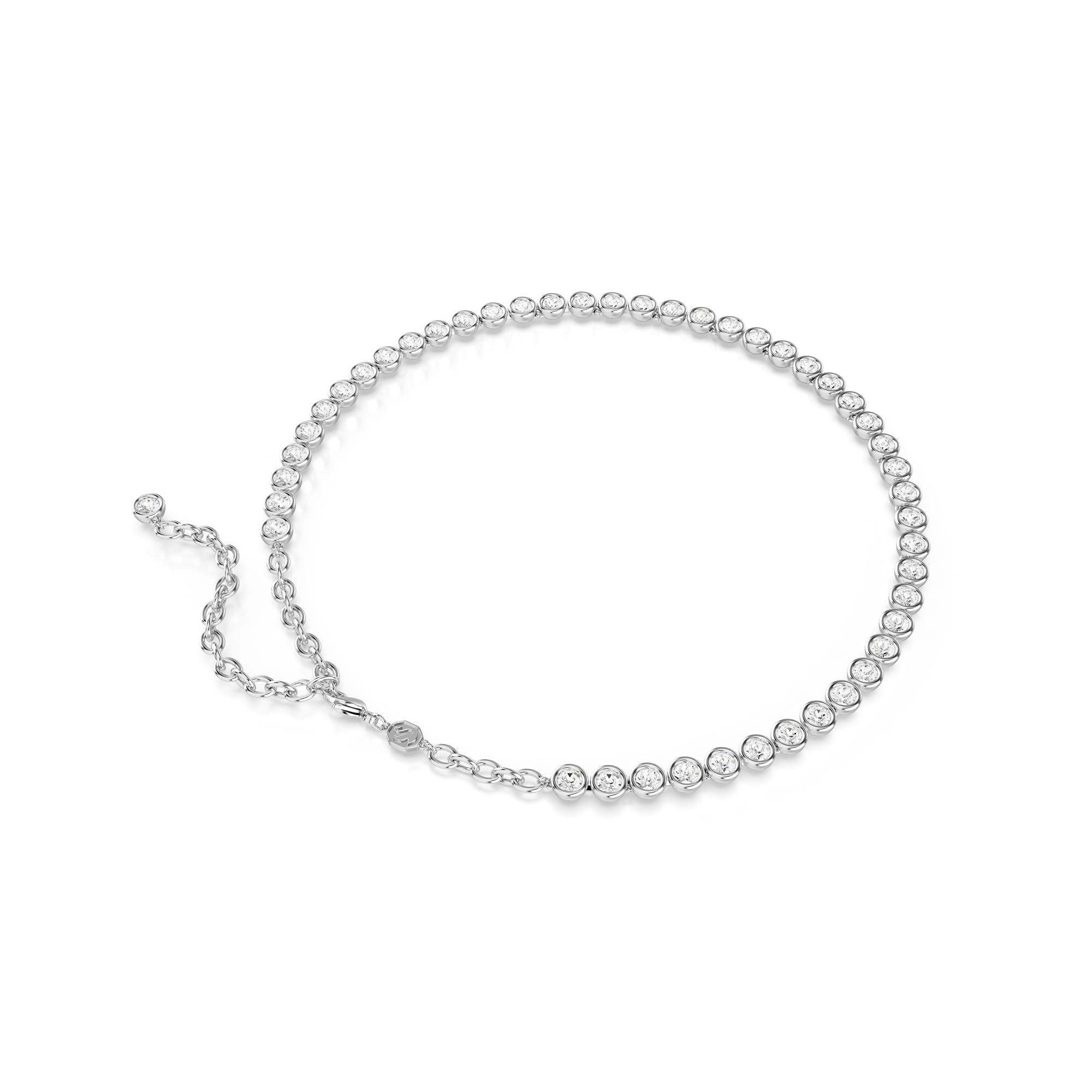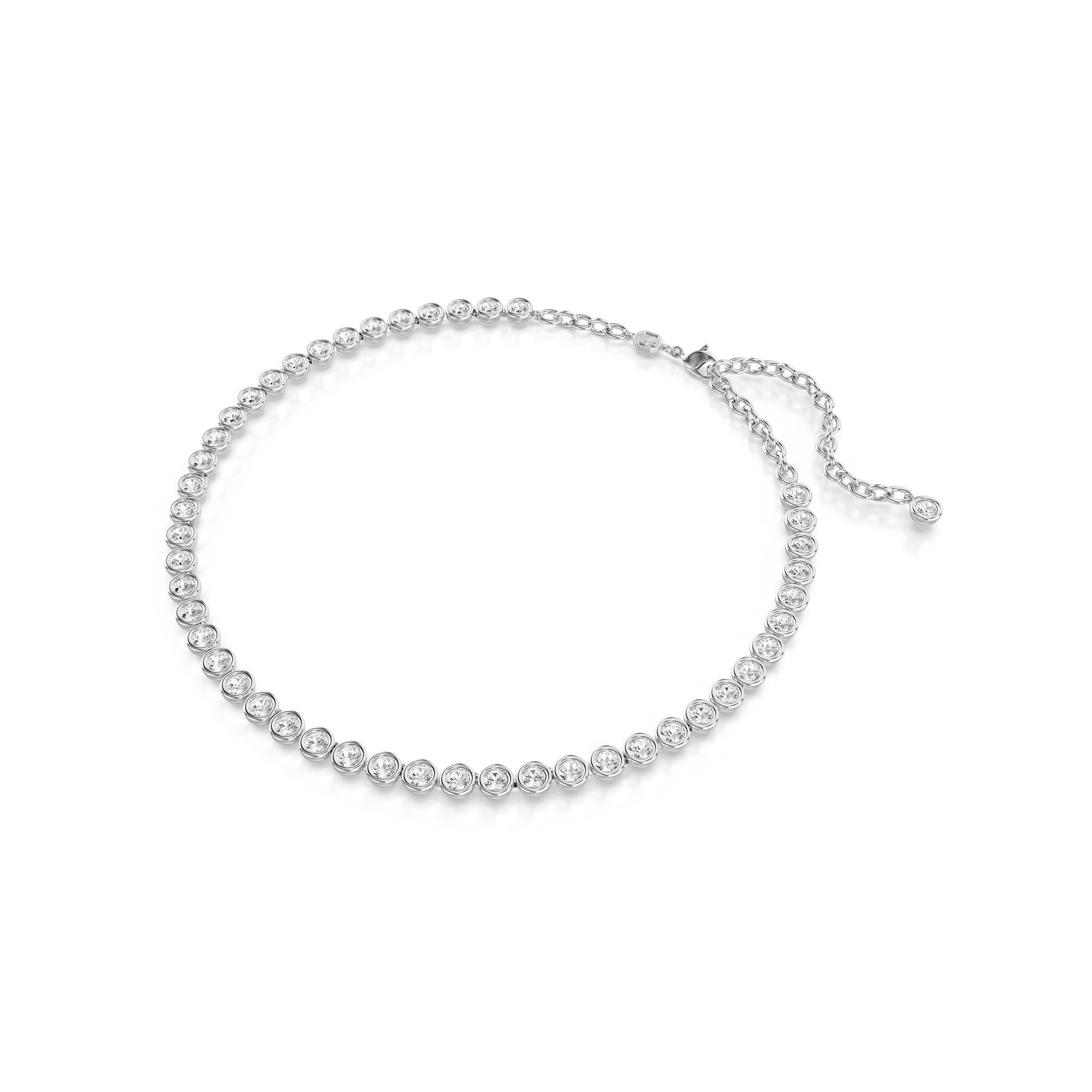 Discover timeless elegance with the Swarovski Imber Tennis Necklace, a radiant expression of refined style. Designed for effortless versatility, this piece showcases an all-around strand of round-cut Swarovski crystals, each nestled within a puffy bezel setting that enhances its brilliance and luminosity. The sleek rhodium-plated finish adds a contemporary touch, ensuring a lustrous shine that complements any outfit.