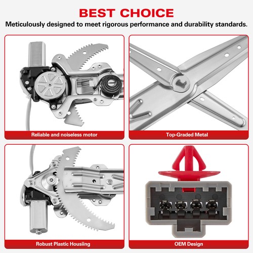 Our window regulator offer value without compromising quality. It with premium material and solid construction, ensures high strength and reliability. They direct fit -No missing holes, hardware or mounting brackets. It has been 100% tested for RPM, rotational direction, amperage and torque before shipment.