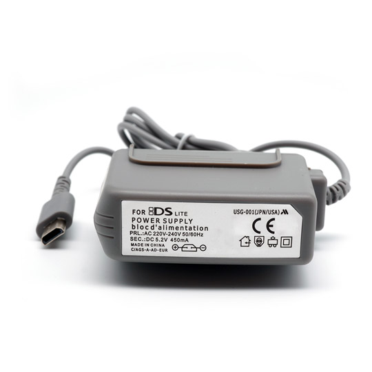 Netzteil für Nintendo DS Lite Handheld Konsole. 5,2 V Ausgangsspannung, 450 mA. Es ist ein europäischer Stromstecker verbaut, der ohne Adapter auskommt. Das verbaute Kabel ist ausreichend dick und stabil, um nicht gleich abzuknicken.