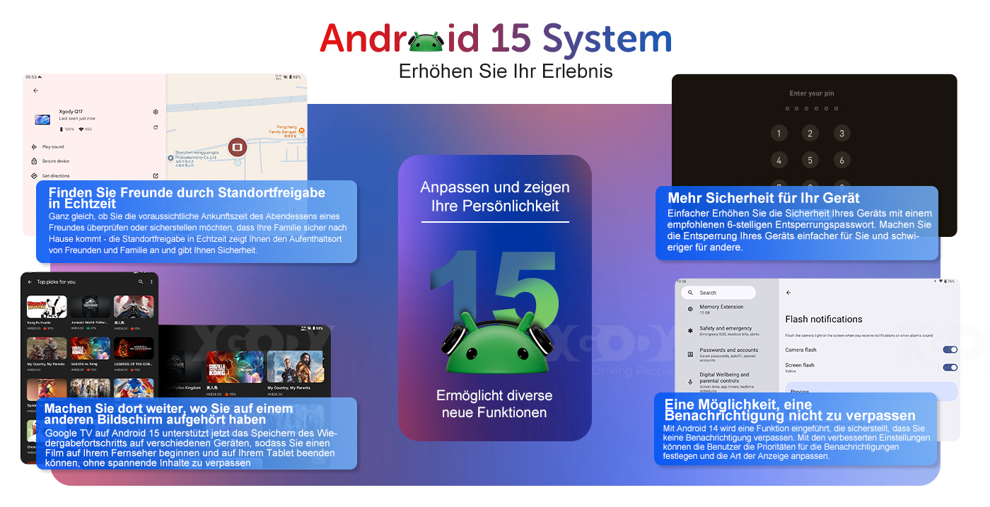 Das XGODY Q17 Tablet wird mit dem neuesten Android 15-System geliefert. Ermöglicht Ihnen, die von Apps verwendeten Berechtigungen zu überprüfen und festzulegen, um Datenschutzverletzungen von der Wurzel aus zu verhindern. Basierend auf der Systemsicherheit bietet es verbesserte Benutzeroberflächen und Funktionen, personalisierte Designs und Symboltools usw. Das XGODY Q17 Android 15 Tablet bietet Ihnen ein personalisiertes, sichereres und entspannteres Erlebnis. |