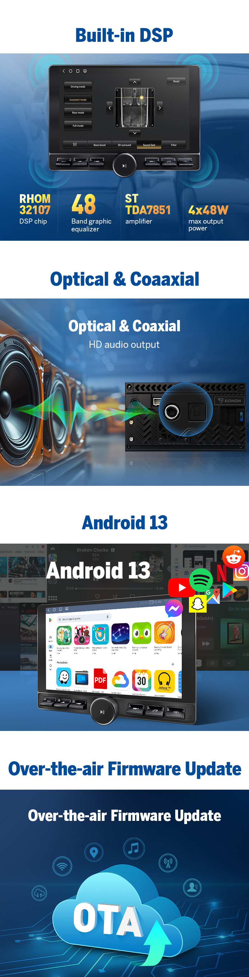 Can I further improve my car’s audio quality? Do you recommend any compatible upgrades? ➡️ Yes. For drivers who want stronger bass, clearer vocals, and higher output, we recommend the Eonon A303 DSP Digital Amplifier Box. It features an automotive-grade DSP chip, built-in Class-D 4×50W amplifier, adjustable EQ/treble/bass, and a compact plug-and-play 16-pin design compatible with many factory and aftermarket head units. Easy installation, excellent heat dissipation, and noticeable sound improvement make it an ideal audio upgrade.