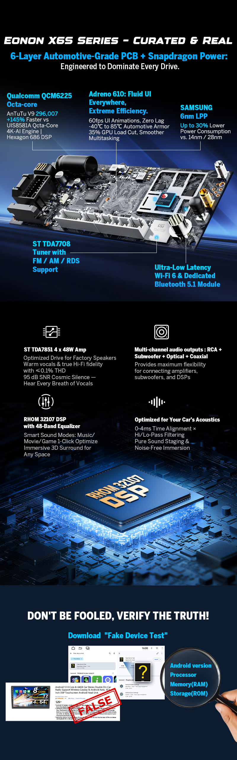 Equipped with a Qualcomm QCM6225 6nm 8-core processor, 8GB RAM, and 128GB storage, the UX6K PRO MAX ensures lightning-fast operation, smooth multitasking, and ample room for apps, music, and offline maps. The anti-glare, detachable 10.1” QLED touchscreen provides enhanced visibility in sunlight or low-light, reducing distractions and increasing road safety. Always-on 4G LTE and WiFi 6 connectivity keep you online, while studio-grade DSP audio ensures premium sound that turns every drive into an experience.