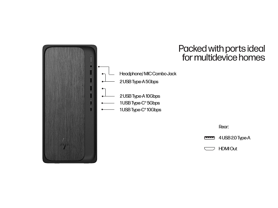 Front : 1 USB Type-C® 10Gbps signaling rate; 1 USB Type-C® 5Gbps signaling rate; 2 USB Type-A 10Gbps signaling rate; 2 USB Type-A 5Gbps signaling rate; 1 headphone/microphone combo