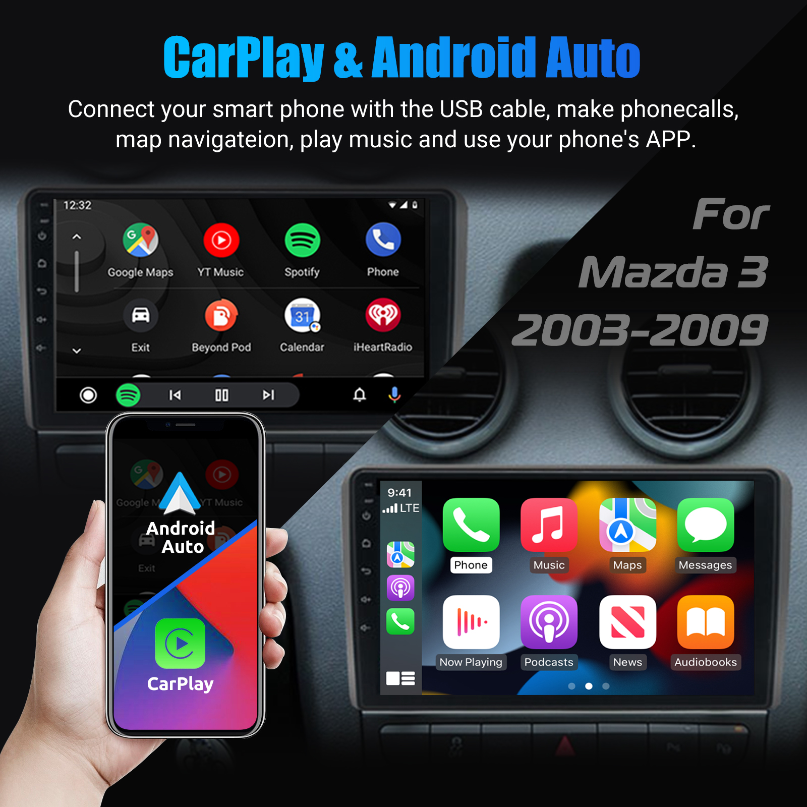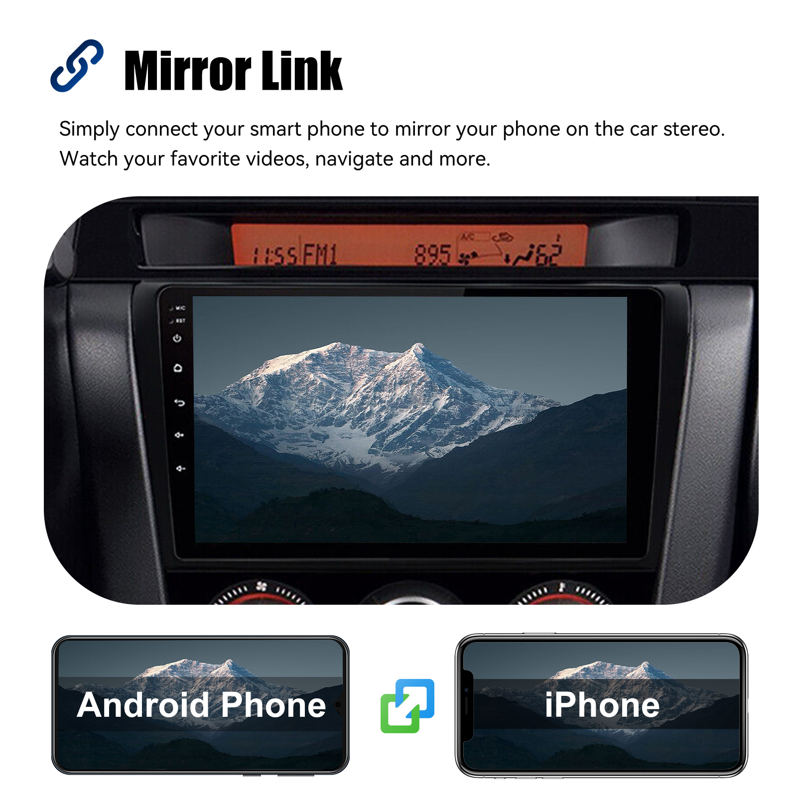 MIRROR LINK & APPLE CARPLAY & ANDROID AUTO: With this car radio, you can experience the amazing Mirror Link function, compatible with iOS and Android phones. You can mirror your smartphone screen to the car radio using apps like Google Maps, Spotify, Youtube, etc. Replace your cell phone with the car screen and turn your vehicle into a smart platform. Immerse yourself in a seamless and user-friendly infotainment experience with Apple CarPlay & Android Auto. Connect your iPhone to Apple CarPlay or your Android smartphone to Android Auto and securely access calls, texts, navigation, music and more. With intuitive operation via the touchscreen or voice control, you have all functions at your fingertips while you remain safely at the wheel. Use your favorite apps and stay connected at all times while keeping your eyes on the road. Turn your vehicle into an extended hub for your mobile devices and experience a new dimension in infotainment.