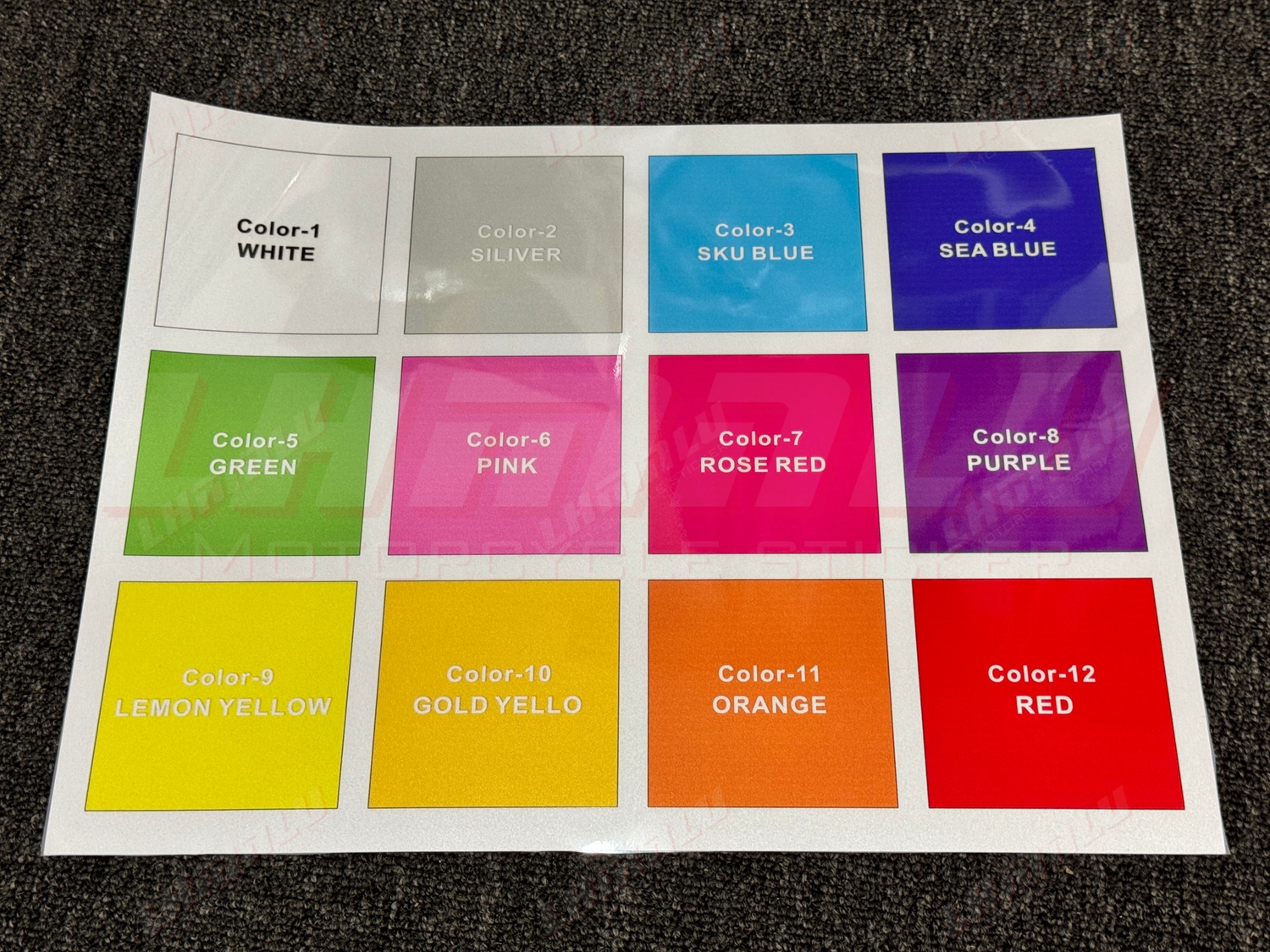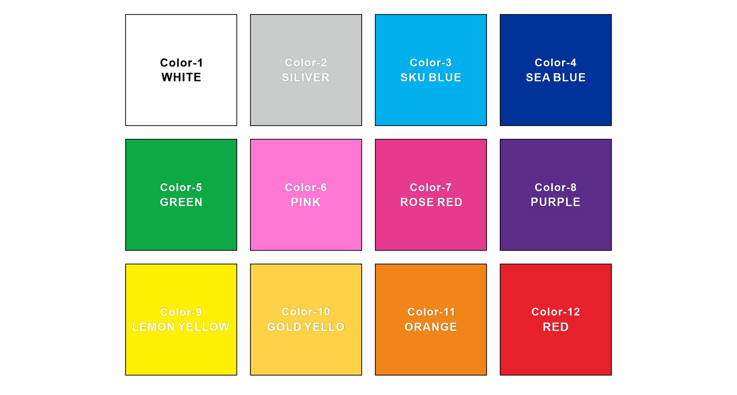 | A) Color-1 WHITE A) Color-2 SILVER A) Color-3 SKU BLUE A) Color-4 SEA BLUE A) Color-5 GREEN A) Color-6 PINK A) Color-7 ROSE RED A) Color-8 PURPLE A) Color-9 LEMON YELLOW A) Color-10 GOLD YELLO A) Color-11 ORANGE A) Color-12 RED |
