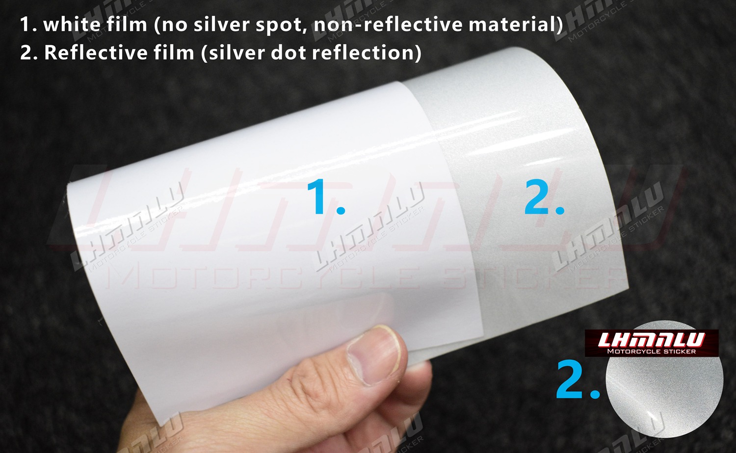 white reflective film with reflective particles, which makes the color more eye-catching under light exposure (similar to road signs); due to the reflective particles, the white seen by the naked eye is close to silver