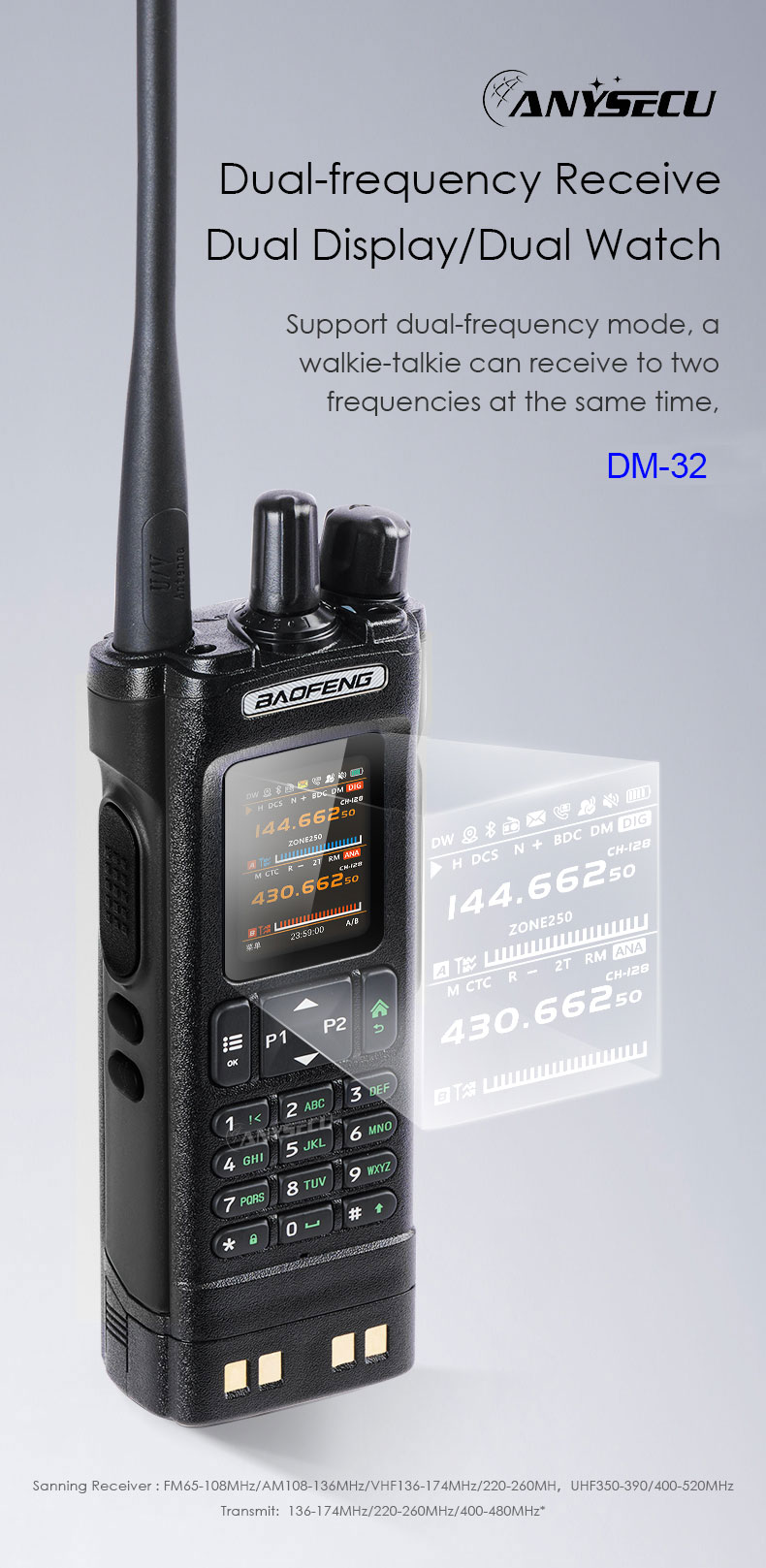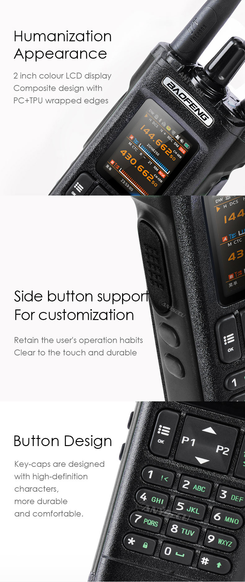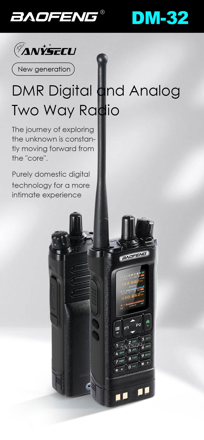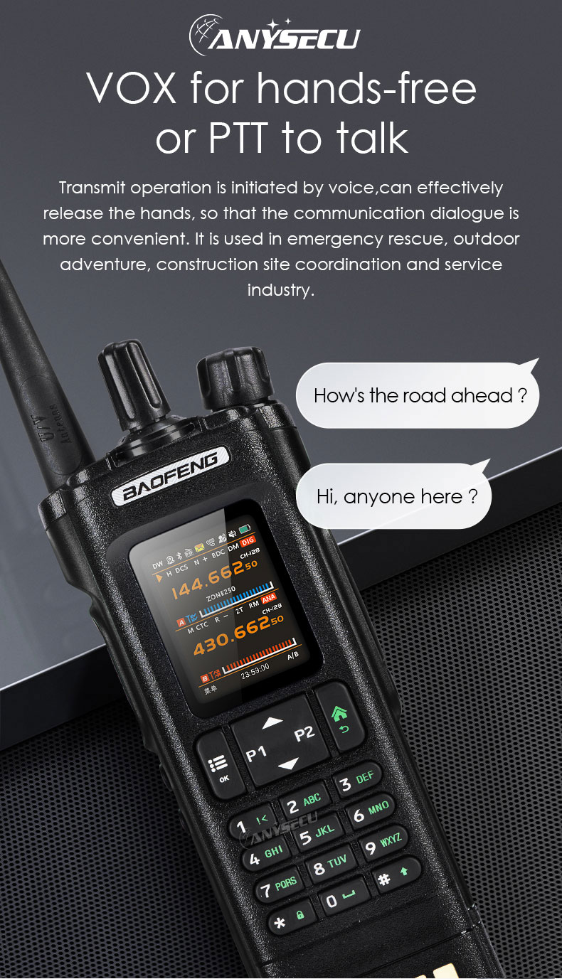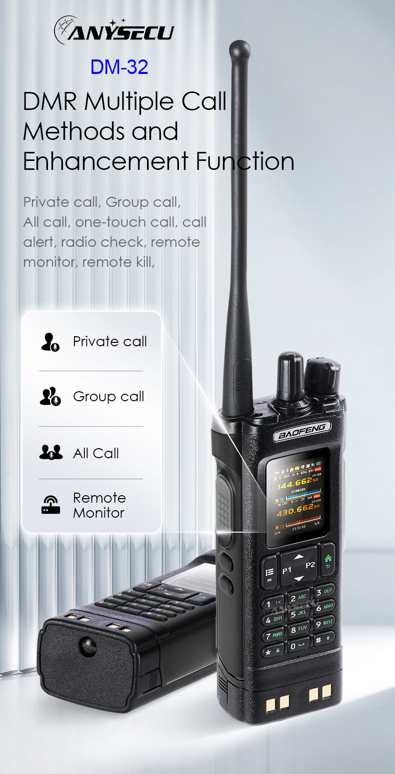 –Using AMBE+2™ voice encoder, the voice is clear and loud, without noise interference This digital walkie-talkie adopts advanced AMBE+2TM voice processing technology to achieve high sound quality