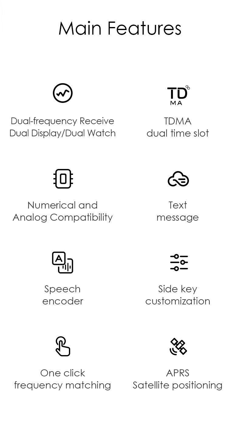 · One-key frequency binding in analog mode, digital monitoring, channel and frequency scanning · Independent work, digital alarm function · Side key custom settings, without changing the user’s operating habits of the machine · Satellite positioning, APRS automatic position reporting, FM radio function · Support APRS, roaming.