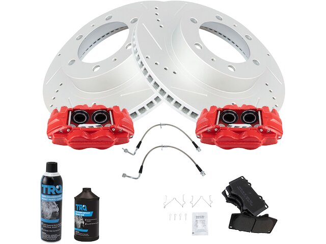 Package Contents: (1) Front Semi-Metallic Brake Pad Set; (2) Front Performance Brake Calipers; (2) Front Stainless Steel Performance Brake Hoses; (1) Brake Cleaner & Fluid Kit; (1) Front Premium G-Coated Performance Brake Rotor Set