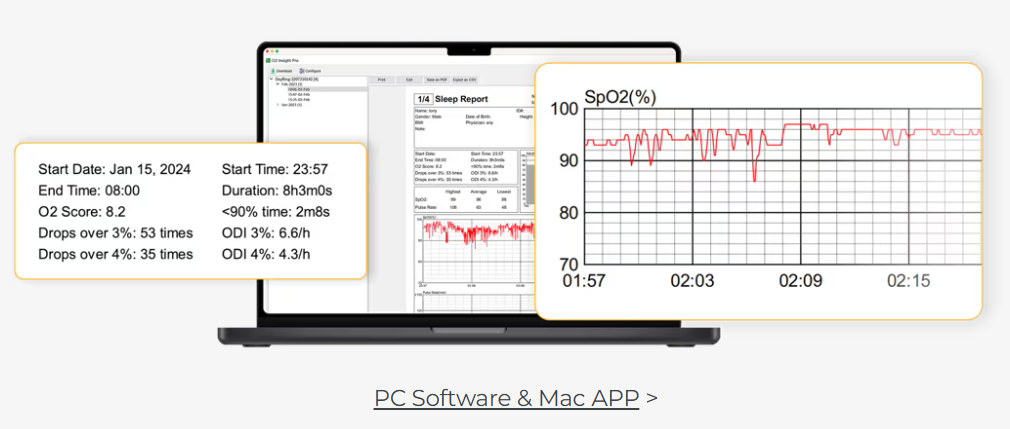 O2Ring detects this drop in oxygen saturation along with heart rate changes and alerts the user through vibration. When this happens repeatedly, the device records all the data, which can be reviewed via the app to help identify potential sleep apnea issues.