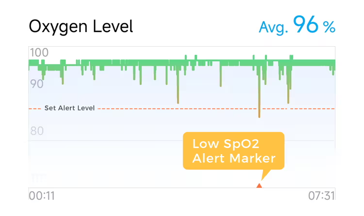 A summary of oxygen drops, low SpO duration, and your nightly Oxygen Score—data you can actually use to track your sleep health.