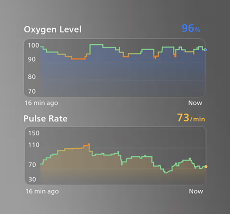 View real-time oxygen levels, pulse rate, and motion data in the free iOS & Android app. No delay, no guessing.