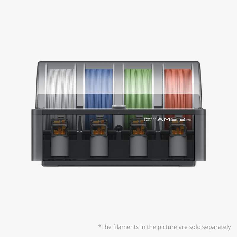 Bambu Lab AMS 2 Pro Please ensure that you select the appropriate accessories based on your printer model and intended use. https://futurology.tech/products/ams-2-pro-upgrade-kit For X1/P1 owners, a switching adapter is needed to power the drying function. Since filament drying lasts long, you rarely need multiple adapters running simultaneously. The optional adapter helps lower the price. For H2D owners, the H2D can power any connected AMS 2 Pro units for drying. Therefore, if you don't plan to operate multiple AMS 2 Pro units at the same time, you won't need an adapter. AMS, Evolved. • 24-Color/Multi-material: Serially connect up to 4 AMS 2 Pro & 8 AMS HT units, total of 24 filaments.• Electro-Magnetic Air Vent: Fast filament drying & air-tight filament storage.• 65°C Drying: Up to 65°C drying temperature.• Brushless Motor: 60% faster feeding speed. Dry Filament Quickly and Intelligently Electro-Magnetic Air Vent Automated venting facilitates dehumidification during drying and ensures airtight sealing for weeks of high-quality printing. Auto-rotate Drying During the drying process, the filament spools rotate automatically to ensure more even drying. RFID Sync AMS 2 Pro uses RFID to auto-match drying settings for Bambu official filaments, no manual input is needed. Speed Up! Faster Multi-material Printing! The powerful Bambu permanent magnet synchronous servo motor accelerates filament feeding by 60% for enhanced efficiency.Saves an average of 10 minutes per 100 filament changes.Faster multi-color printing Evolved, Polished Design Details Tool-Free Filament Tubes Access Removing snapped filament from the first-gen AMS requires extracting all spools and disassembling the shell with two screws, taking 3-5 minutes. In contrast, the AMS 2 Pro offers direct, tool-free access to filament tubes from the top. Ceramic Inlet Ceramic filament inlets with Vickers hardness of 1200 significantly enhance durability. Compatible With All Bambu Lab Printers The AMS 2 pro is compatible with all Bambu Labs products Item Specification Body Dimensions 372*280*226 mm³ Net Weight 2.5 kg Housing Material ABS/PC Printing Filament Supported PLA, PETG, ABS, ASA, PET, PA, PC, PVA (dried), BVOH (dried), PP, POM, HIPS, Bambu PLA-CF/PAHT-CF/PETG-CF/Support for PLA/PETG, and TPU for AMS Filament Not Supported TPE, generic TPU, PVA (damp), BVOH (damp),Bambu PET-CF/TPU 95A, and other filament that contains carbon fiber or glass fiber Filament Diameter 1.75 mm Spool Dimension Width: 50 mm-68 mm Diameter: 197 mm-202 mm RFID Identification Supported Drying Highest Temperature 65 °C Filament Supported PLA, PETG, Support for PLA/PETG, ABS*, ASA*, PET*, PA*, PC*, PVA*, BVOH *, PP, POM*, HIPS*, Bambu PLA-CF*/ PAHT-CF*/ PETG-CF*, and TPU for AMS* Active Moisture Discharge Supported Sealed Storage Supported Temperature and Humidity Detection and Maintenance Supported. Real-time temperature and humidity can be displayed on the screen, Bambu Studio, and Bambu Handy. Power Input 24 V 4 A