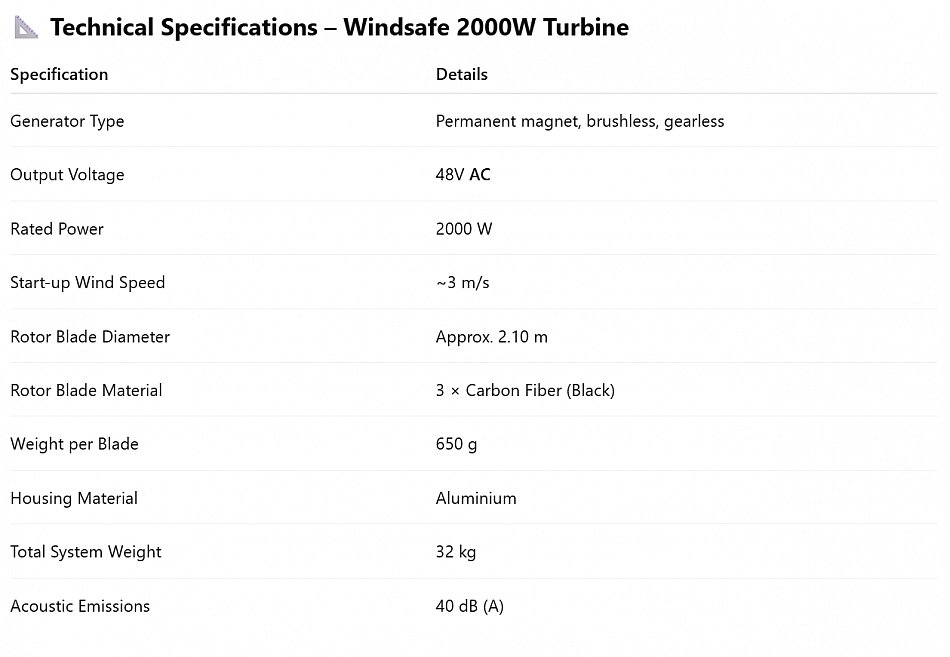 With a rated power output of 2000 watts, the Windsafe turbine is capable of delivering a significant share of household energy needs. This high performance ensures both cost-effectiveness and strong energy yield, even under variable wind conditions.