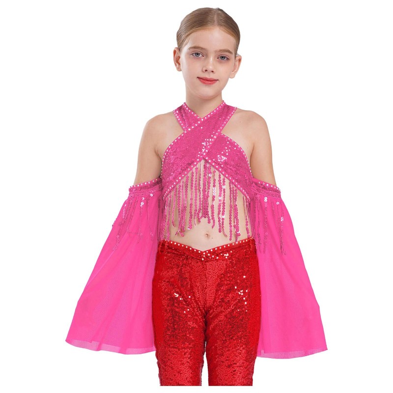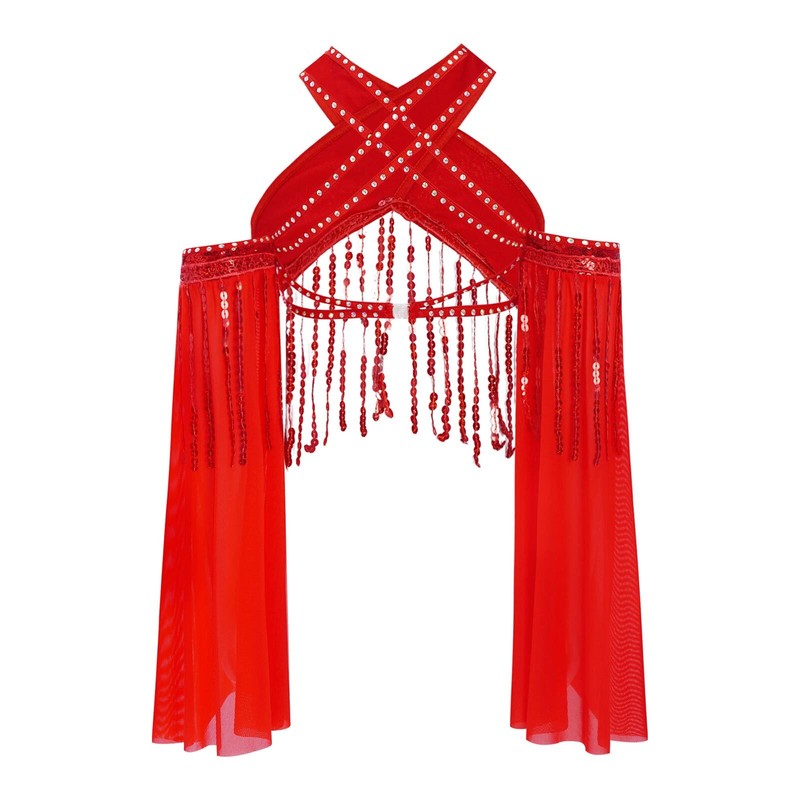 Tassels dance top sways gently with dance steps to add a sense of movement and sheer mesh flared sleeves create a flowy effect.