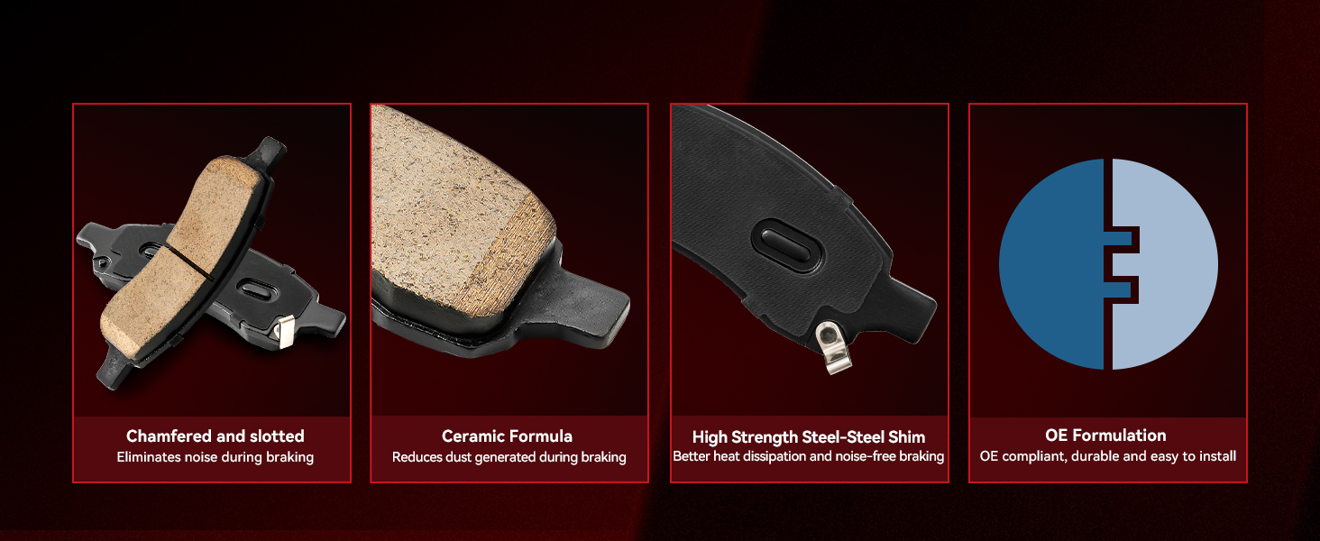 4.Low-Dust & Low-Noise --Ceramic brake pads are quieter than metal and last twice as long. The unique formula reduces dust by 30%, keeping your wheels clean even after long-time driving.
