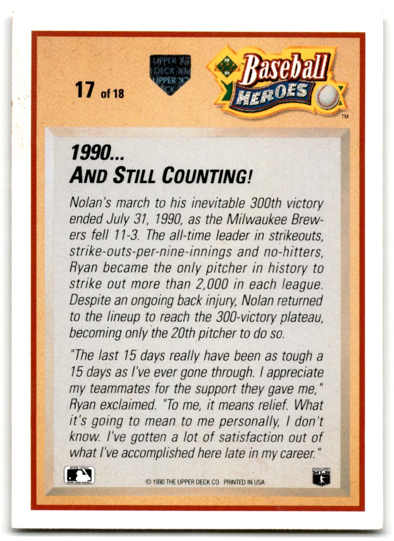 1991 Upper Deck Baseball Heroes Nolan Ryan Nolan Ryan Texas Rangers #17