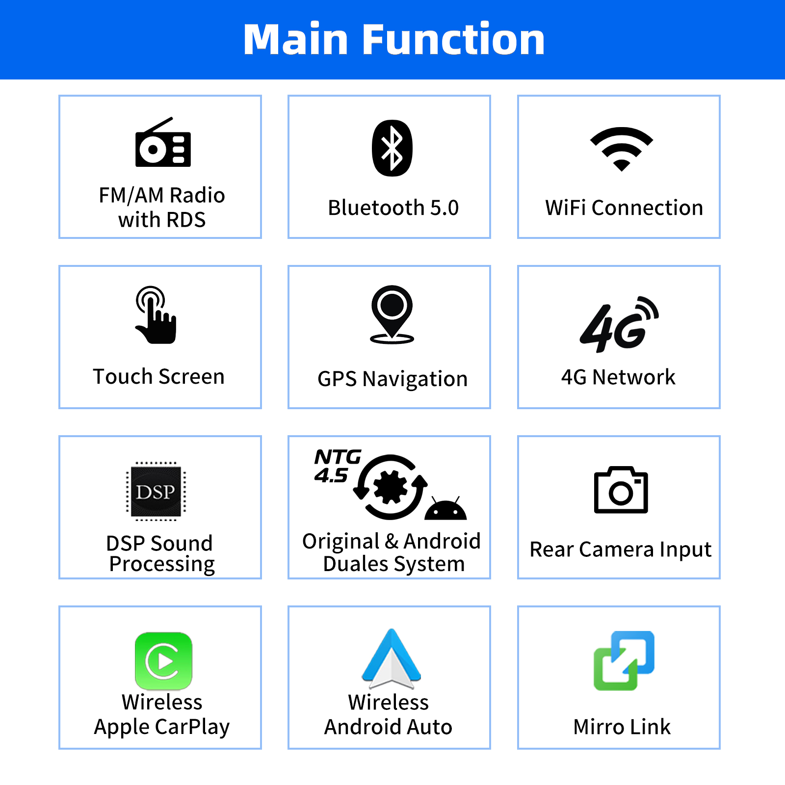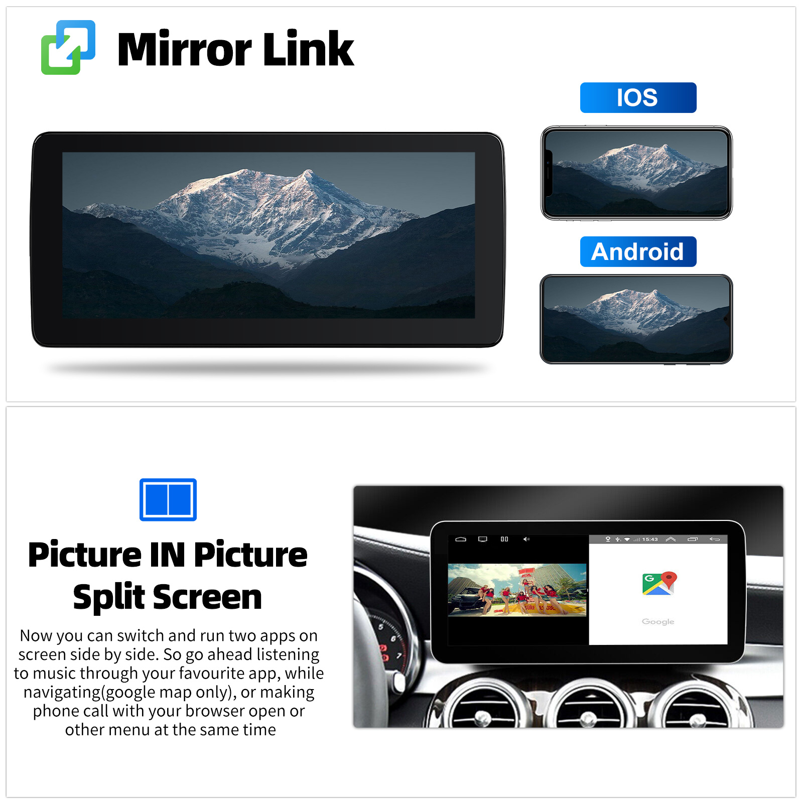 Mirror Link for iOS/Android: With this car radio, you can experience the amazing Mirror Link function, compatible with iOS and Android phones. You can mirror your smartphone screen to the car radio using apps like Google Maps, Spotify, Youtube, etc. Replace your cell phone with the car screen and turn your vehicle into a smart platform