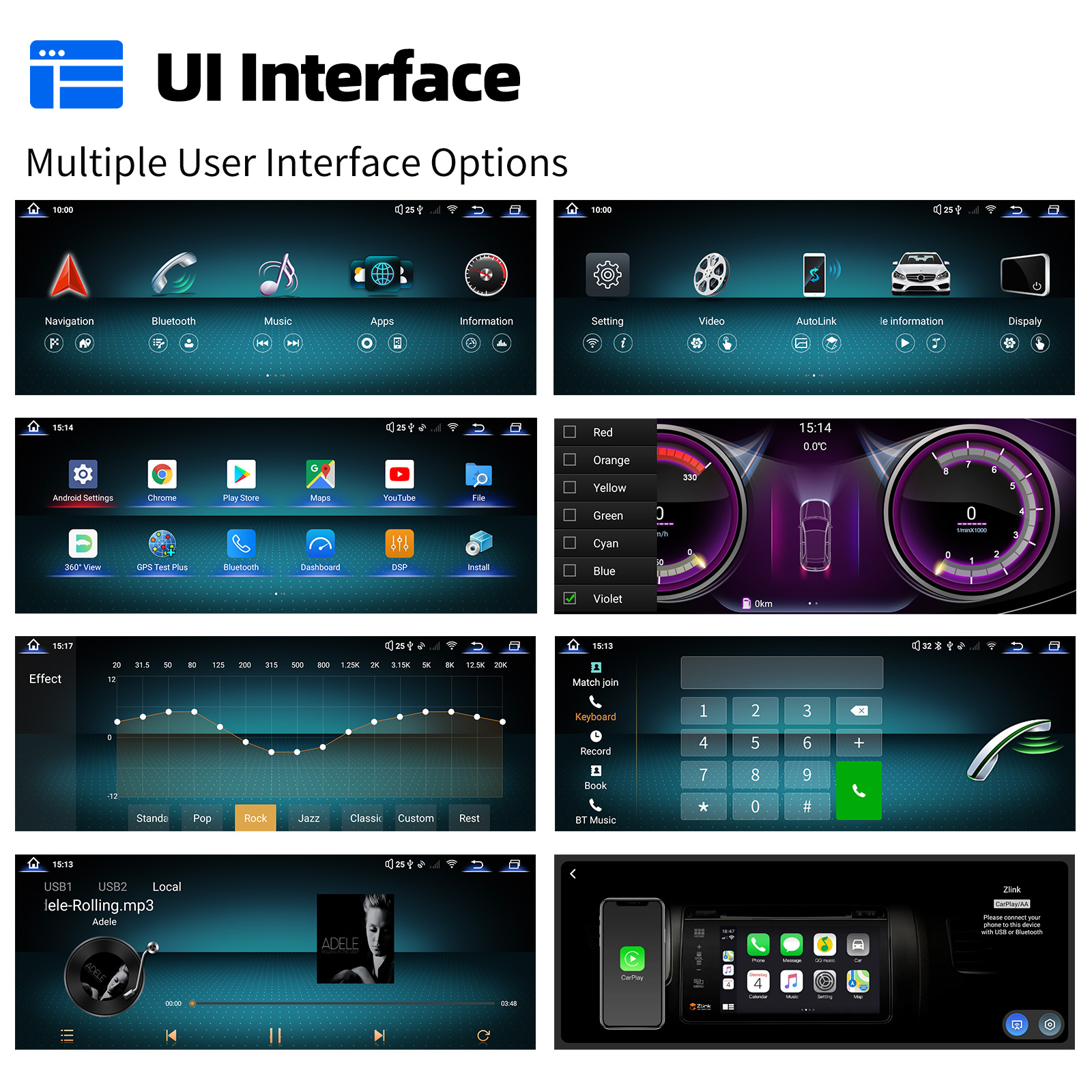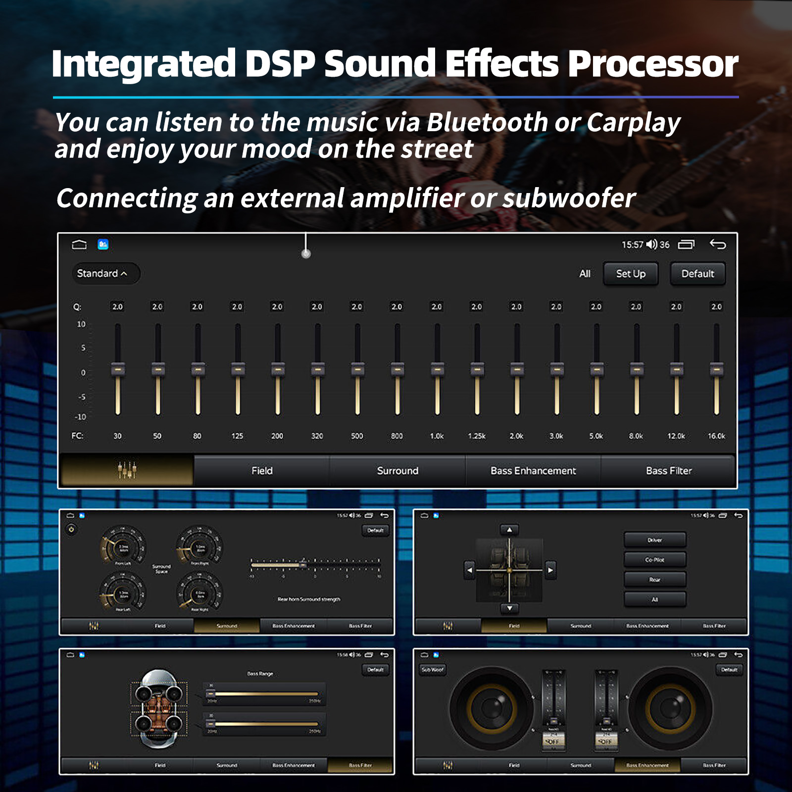 FM/AM/RDS radio, Bluetooth, and DSP sound: Supports Bluetooth 5.0, with built-in microphone, allowing you to make hands-free calls while driving. Supports access to the phonebook, music playback interface, etc. Supports RDS. You can store 18 FM and 12 AM radio stations. Built-in DSP chip. Supports 48-band EQ adjustment. With the DSP function, you can individually adjust the sound of each speaker using various equalization methods: jazz, rock, pop, classical, etc., to achieve an exceptional listening experience tailored to your personal preferences. 4 x 45W amplifier, surround sound, and subwoofer output.