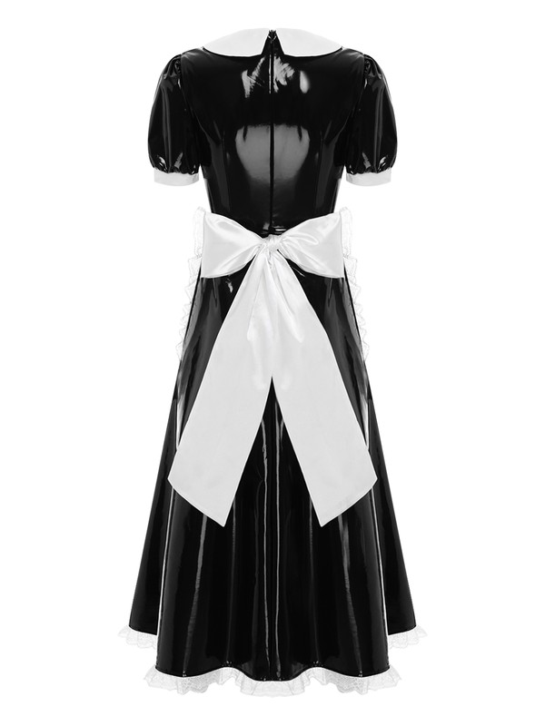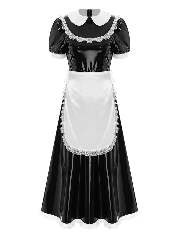 Women Wet Look PVC Leather Maid Costume Cosplay French Maid Set with Satin Apron
