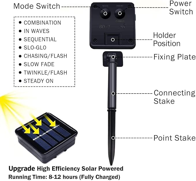 Solar Powered: Our solar LED lights is charged by solar energy, which is environmentally friendly and does not waste electricity. This solar outdoor lights chain has 600mAh large capacity built-in battery. It can be fully charged for about 4 hours under direct sunlight during the day, and can be bright for 10 hours under full charge.