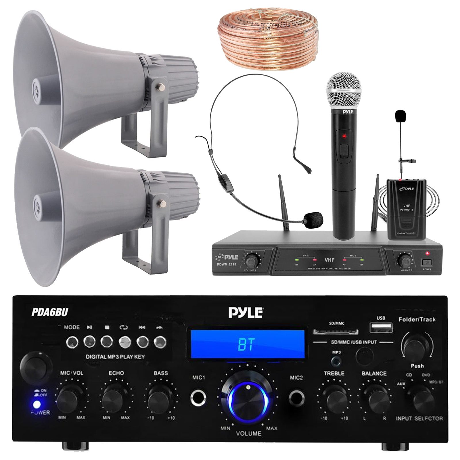 PACKAGE BUNDLE INCLUDES: Pyle PDA6BU Bluetooth Amplifier Receiver, 2X 16" 80 Watt Max PA Horn Speakers, Wireless Microphone System with Transmitter, 18G Speaker Wire