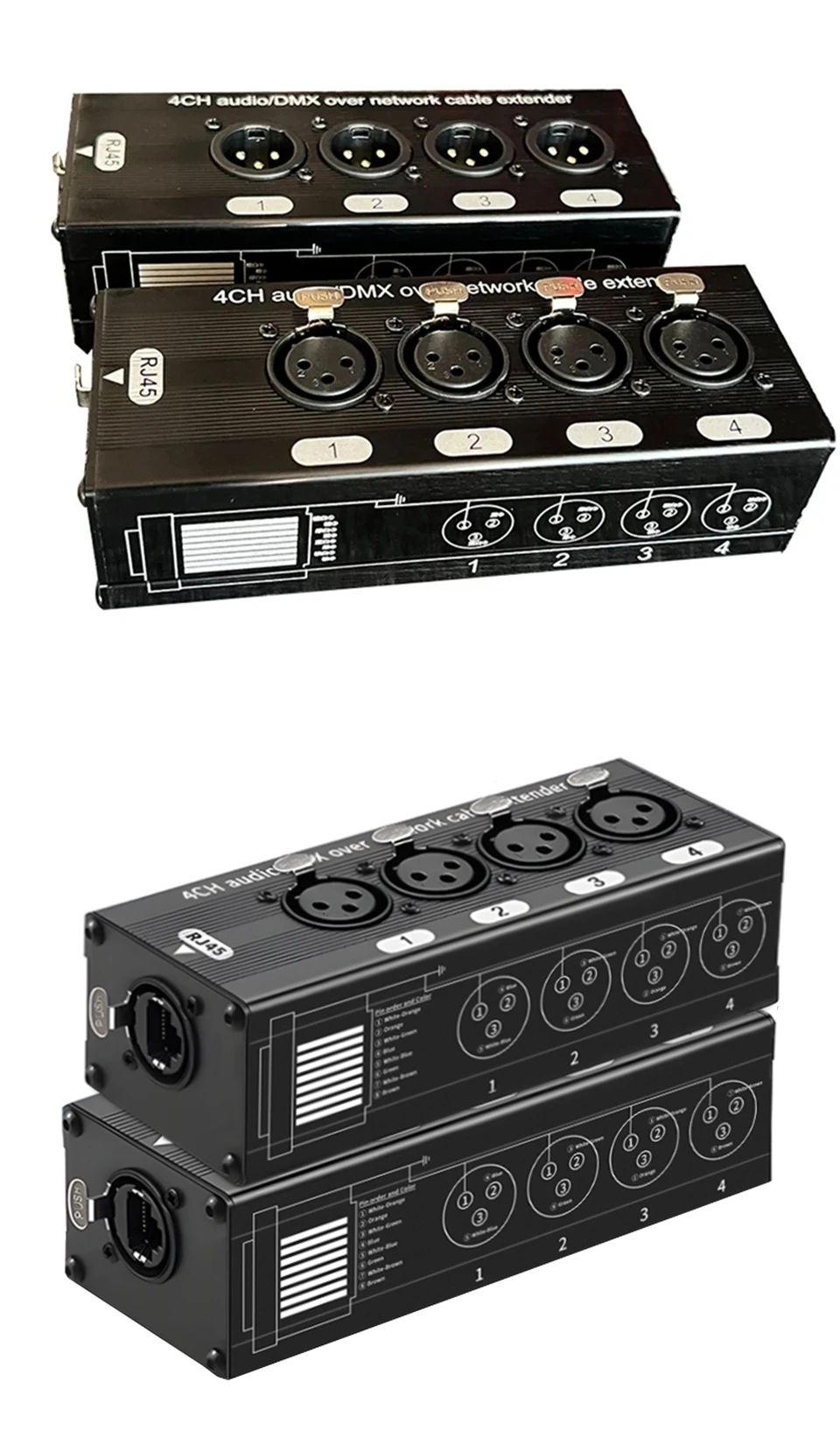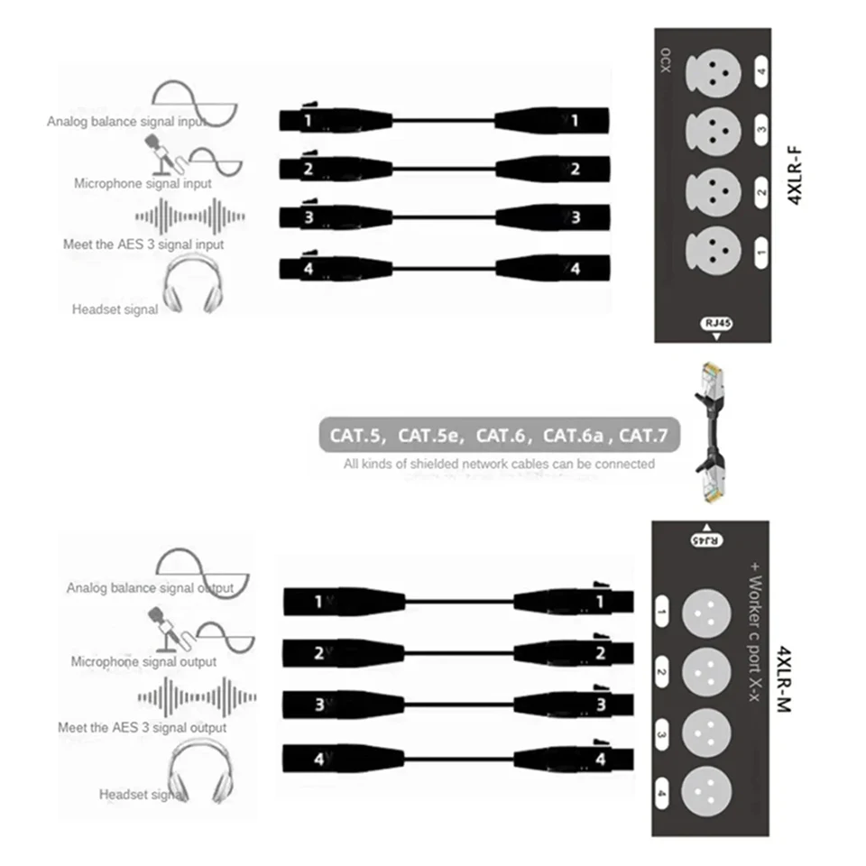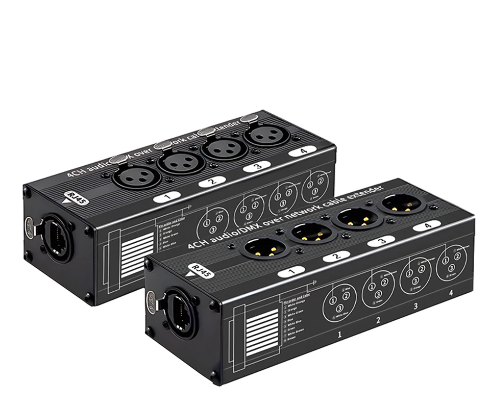 These two of our adapters carry 4 analog XLR audio signals over a single RJ45 network cable, connect audio from mixers, microphones and instruments to the XLR ports, and route all 4 signals over a shielded balanced Ethernet cable to the Another adapter.