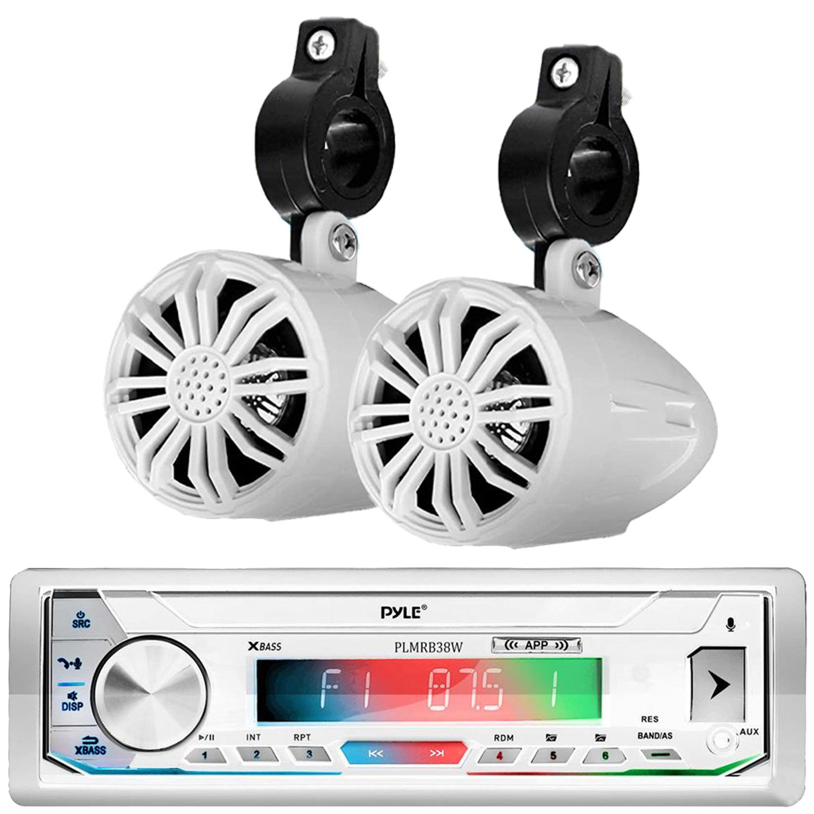 • PACKAGE BUNDLE INCLUDES: Pyle PLMRB39W LCD Display Single-DIN Marine Bluetooth USB/AUX MP3 Player AM/FM Radio Stereo White Receiver W/Remote Control, 2x Pyle PLMR22WT 2.25’' 10 Watt Max Power Waterproof Rated Full Range Off-Road White Boat Speakers