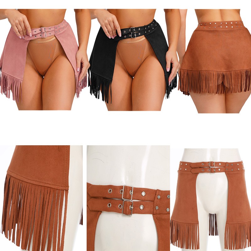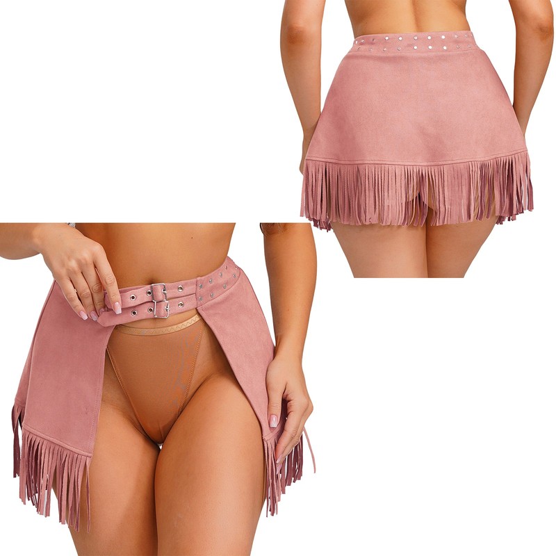 Crafted from faux suede and metal, the skirt offers a unique texture and durability, providing a comfortable yet long-lasting wearing experience.