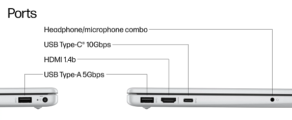 2 USB Type-A 5Gbps signaling rate; 1 AC smart pin; 1 HDMI 1.4b; 1 headphone/microphone combo; 1 USB Type-C® 10Gbps signaling rate (USB Power Delivery 3.1, DisplayPort™ 1.4, HP Sleep and Charge)