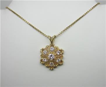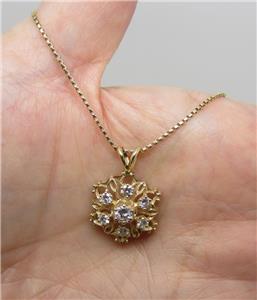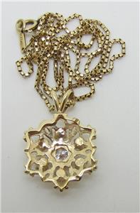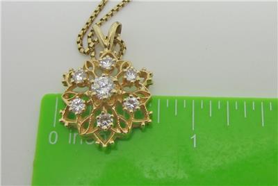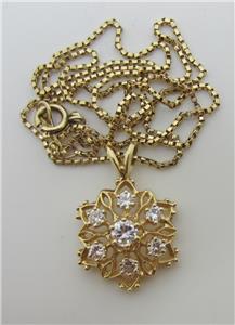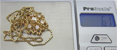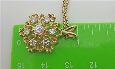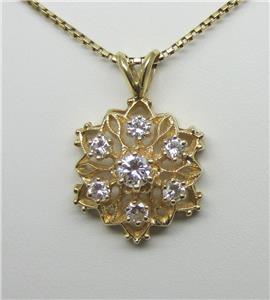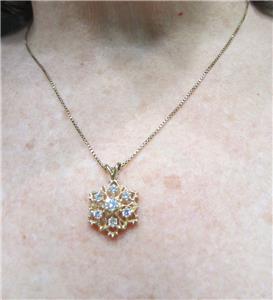 This beautiful pendant and chain are solid gold, the pendant is not marked but has tested 14K gold, and the chain is stamped 14KT Italy. The pendant is designed as a snowflake with seven genuine natural diamonds VS1-VS2 in clarity, G-H in color. The diamond in the center is approximately 0.31 ct, and the other six diamonds total approximately 0.50 ct. for a total approximate diamond weight of 0.81 ct. The pendant comes with an 18" long box chain. The necklace was appraised by a GIA Certified Master Graduate Gemologist and the full detailed report will be included with the item. The replacemnt value of this pendant and chain is $4,059.38.