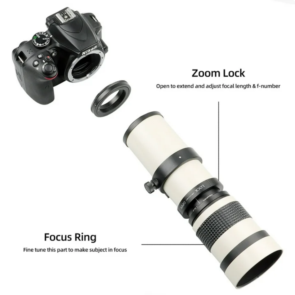 Versatile 420-800mm manual zoom telephoto lens for DSLR and mirrorless cameras